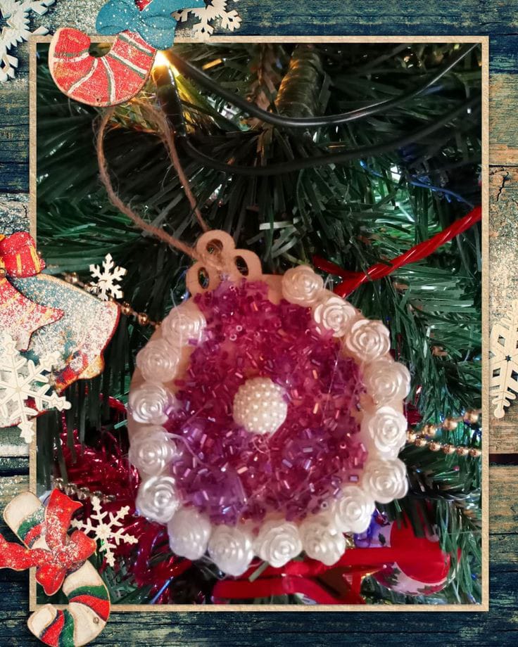 Ho realizzato questa decorazione natalizia utilizzando una piccola base in legno che, con l’aiuto della colla a caldo, ho rivestito con tante perle bianche intorno e piccoli cristalli fucsia al centro, che regalano molta luminosità all’addobbo.