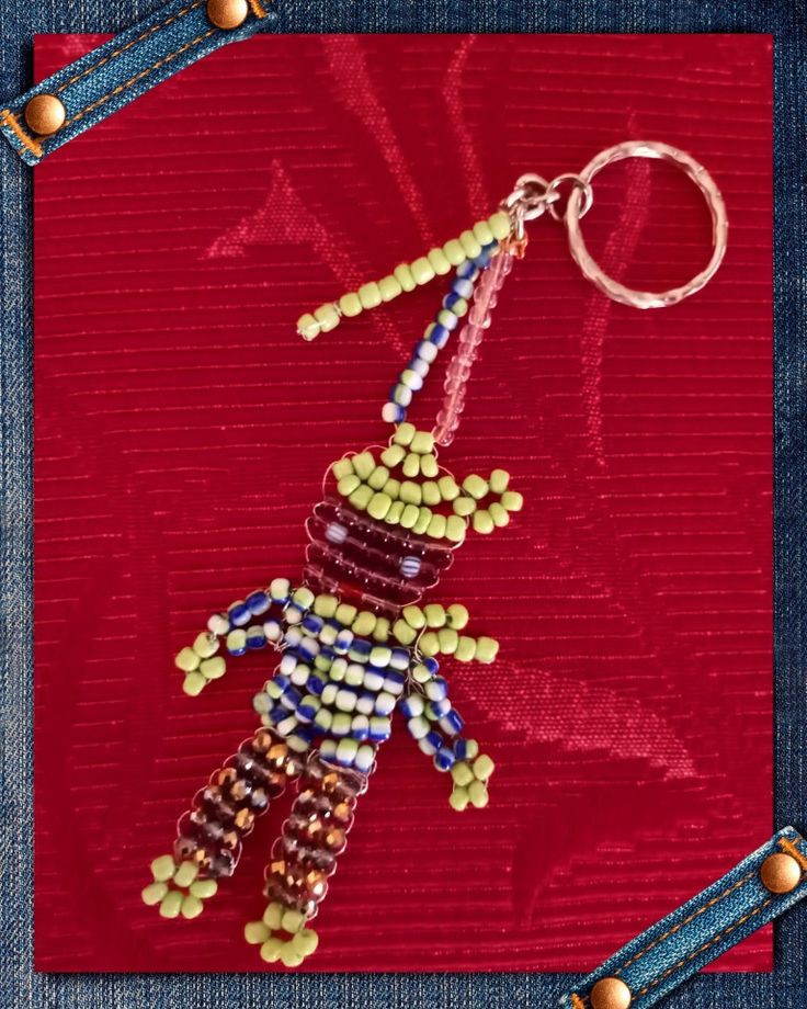 Il portachiavi è diventato ormai per tutti noi un accessorio indispensabile per avere sempre a portata di mano le chiavi e per evitare di perderle per strada nel tentativo di estrarle dalla tasca. Ma può essere anche un elemento portafortuna o un piccolo dettaglio di stile legato alla personalità di chi lo porta. Oggi vi propongo un’idea per rendere il vostro portachiavi ancora più unico e originale, decorandolo con dei ciondoli a forma di bimba e bimbo. Per poterli realizzare vi consiglio di utilizzare delle perline di conteria o dei cristalli (in questo caso di colore oro, blu, rosso e verde), perline “tucat” rosa (così chiamate per la loro forma rettangolare), una spoletta di filo di rame, un portachiavi ad anello e un tronchese laterale. Seguendo lo schema a disegni che vi propongo qui di seguito con le indicazioni sul colore e la quantità di perline da inserire nel filo di rame di volta in volta, il vostro lavoro vi risulterà più facile da eseguire.
