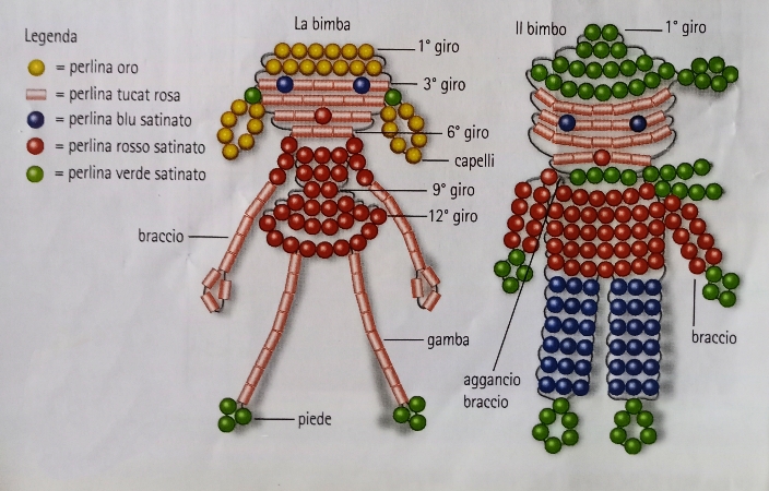 Per iniziare a realizzare la bimba, quindi, infilate in un tratto di 70 cm di filo di rame 13 perline oro, spingetele al centro e passate un’estremità nelle ultime 7 perline infilate. Su di un filo infilate 1 perlina tucat rosa, 1 blu, 3 tucat rosa, 1 blu e 1 tucat rosa, quindi passate l’altro filo attraverso le perline infilate e tirate bene entrambi i fili. Procedendo come descritto nel disegno sopra, eseguite tutta la sagoma tenendo presente che, prima di iniziare il 4° giro, per i capelli dovete infilare su entrambi i fili 1 perlina verde e 7 oro per poi ripassare il filo in quella verde. Dopo il 6° giro lavorate allo stesso modo le braccia seguendo il disegno; al 12° giro infilate su di un filo 3 perline e sull’altro 6, quindi passate il filo con 3 perline nelle ultime 3 perline dell’altro filo. Per le gambe infilate su entrambi i fili 8 perline tucat rosa e 3 perline verdi e avvolgete il filo alla base delle perline tucat rosa per formare i piedi. Infine tagliate le eccedenze. Per realizzare il bimbo, procedete allo stesso modo di come è descritto per la bimba tenendo presente che, prima di iniziare il 4° giro, dovete infilare su di un filo 6 perline verdi e ripassare il filo nella prima perlina infilata. Dopo il 9° giro, su di un filo infilate 4 perline verdi, saltate l’ultima perlina infilata e passate il filo attraverso le altre. Ripetete il movimento un’altra volta. Al 14° giro su di un filo infilate 3 perline e sull’altro 4, quindi passate il filo con 3 perline nell’ultima perlina dell’altro filo. Proseguite così creando le gambe, mentre per i piedi infilate 6 perline verdi, ripassate il filo nella prima perlina infilata e fissatelo con degli avvolgimenti. Per le braccia fissate un tratto di 30 cm di filo di rame nel filo presente tra il 9° e il 10° giro e procedete come descritto precedentemente. Infine per le mani lavorate come descritto per i piedi.