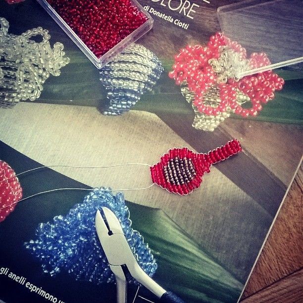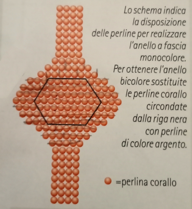 Infine, per realizzare la chiusura, fate passare nelle prime 4 perline infilate all’inizio della lavorazione le estremità di filo in uscita dalle ultime 4 perline infilate. Congiungete quindi le due estremità all’interno dell’anello, avvolgetele fra di loro e tagliate le eccedenze. Allo stesso modo potete realizzare anche gli anelli bicolore, proprio come ho fatto io, sempre seguendo le indicazioni riportate nel suddetto schema.