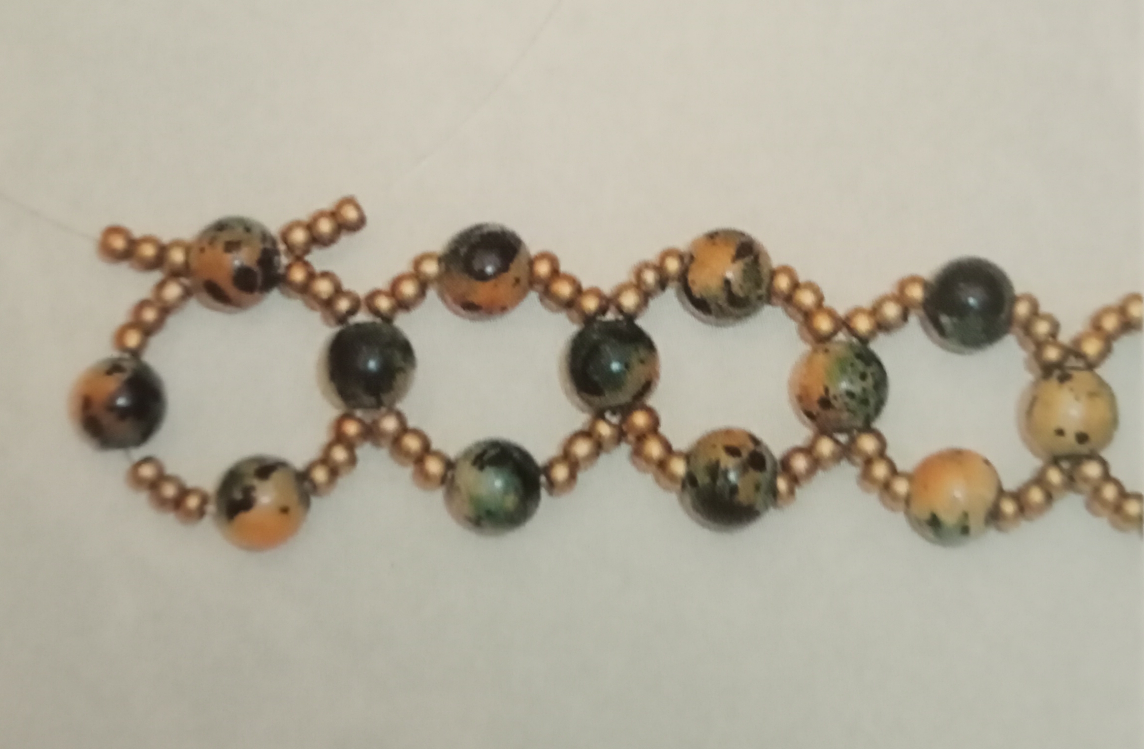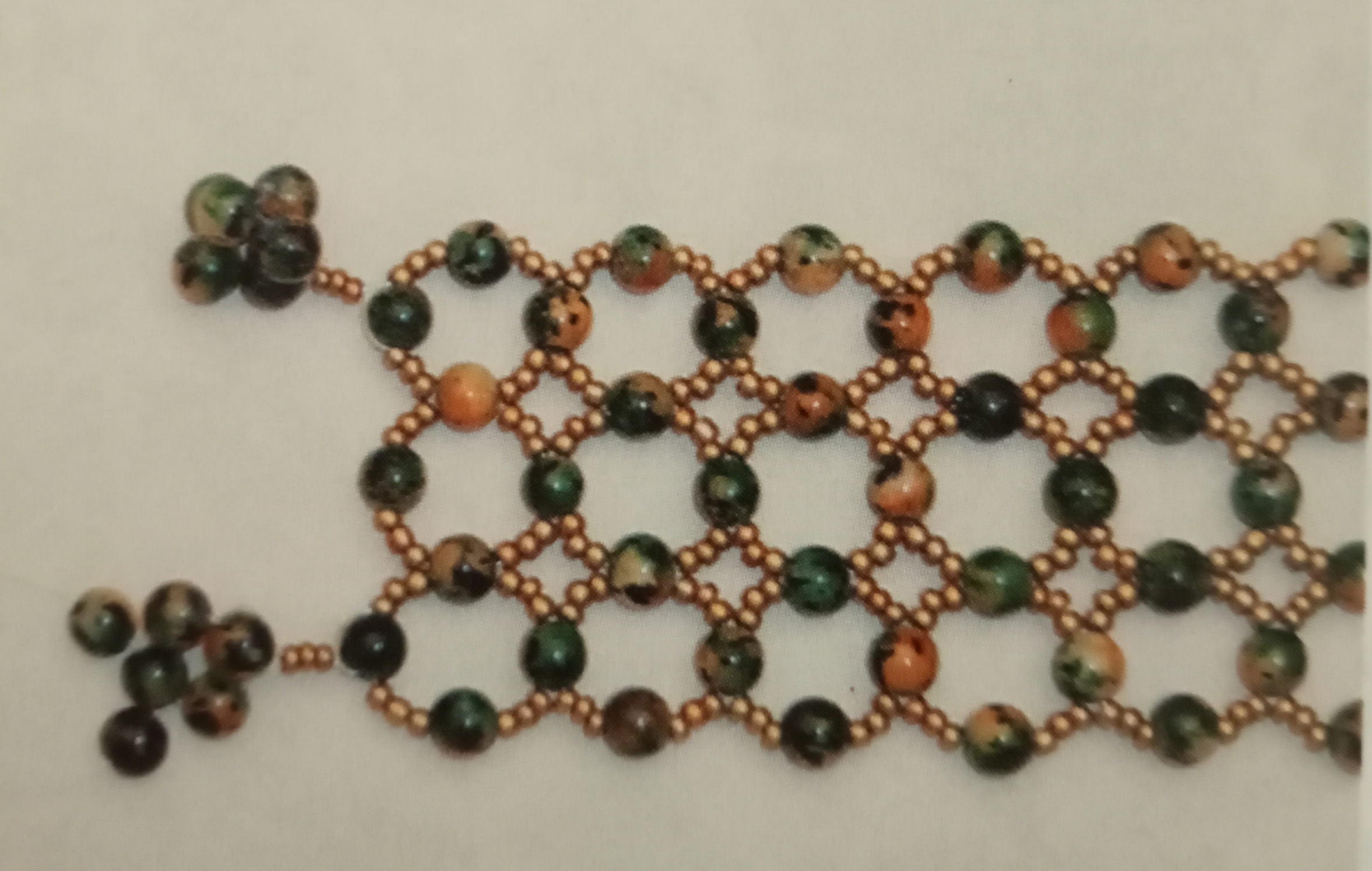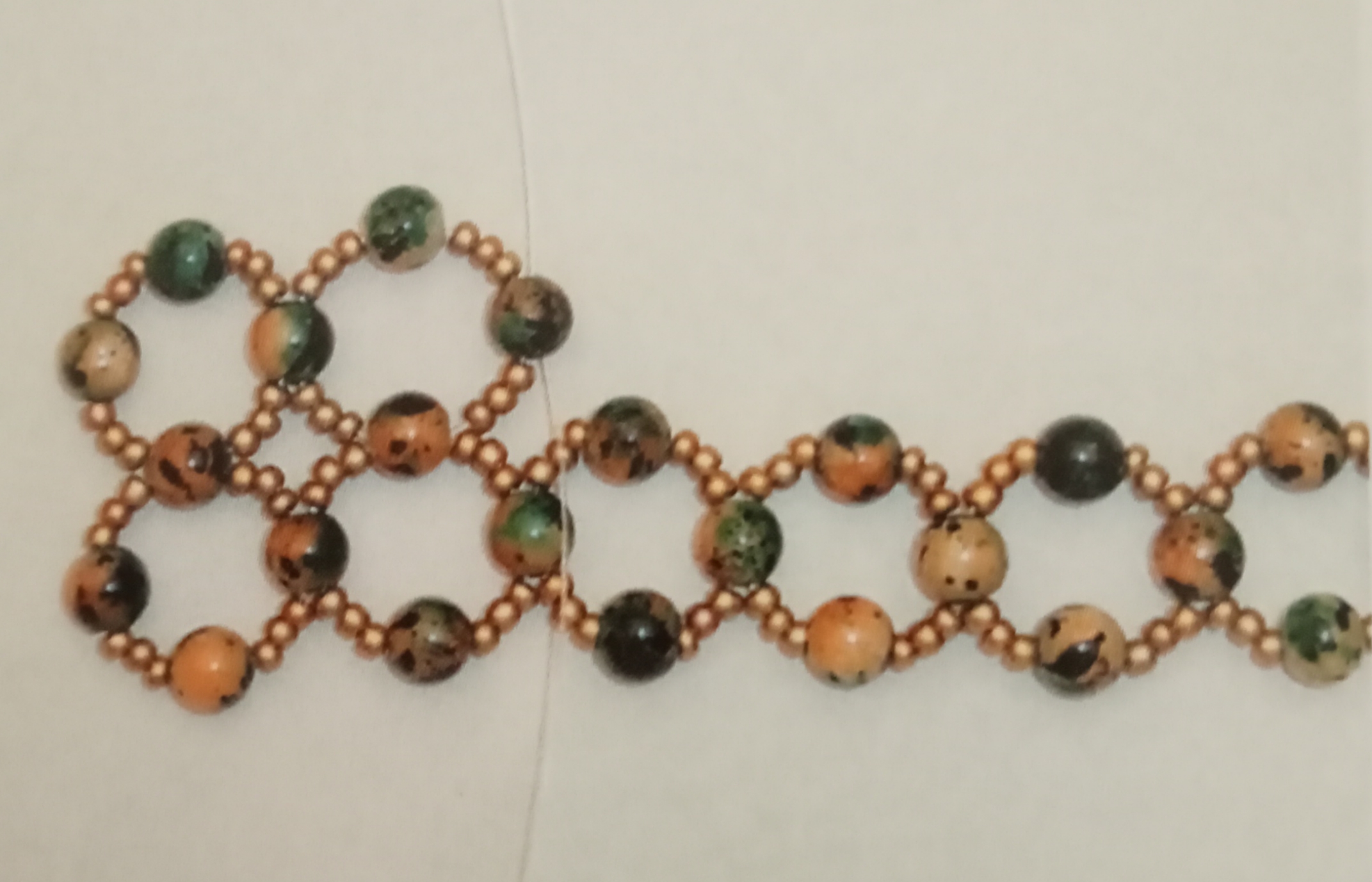 Se vi state chiedendo il motivo di questo titolo a questo articolo, è presto detto. Provate a osservare con attenzione il bracciale presente nella foto, i suoi intrecci di perle non vi riportano alla mente quelli di una vera e propria rete? Ecco perché ho scelto di dare come titolo a questo mio articolo “effetto rete”. Ora passiamo alla lavorazione del bracciale. Prendiamo 2 metri di filo di nylon e infiliamo 1 perla grossa portandola al centro del filo stesso. Proseguiamo inserendo sia da una parte che dall’altra questa sequenza: 3 perline, 1 perla e 3 perline. Infilate ora 1 perla nel filo di sinistra, prendete il filo di destra ed entrate nella stessa perla, ma dal buco opposto, così da formare un cerchio.