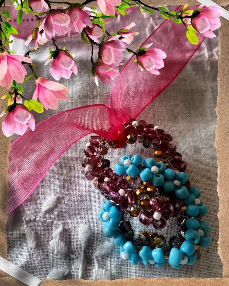 Arrivati a questo punto, per poter indossare il vostro ciondolo a rombi a catena, tagliate un tratto di nastro di organza della lunghezza che preferite e fissatelo con un doppio nodo ad un angolo del ciondolo.