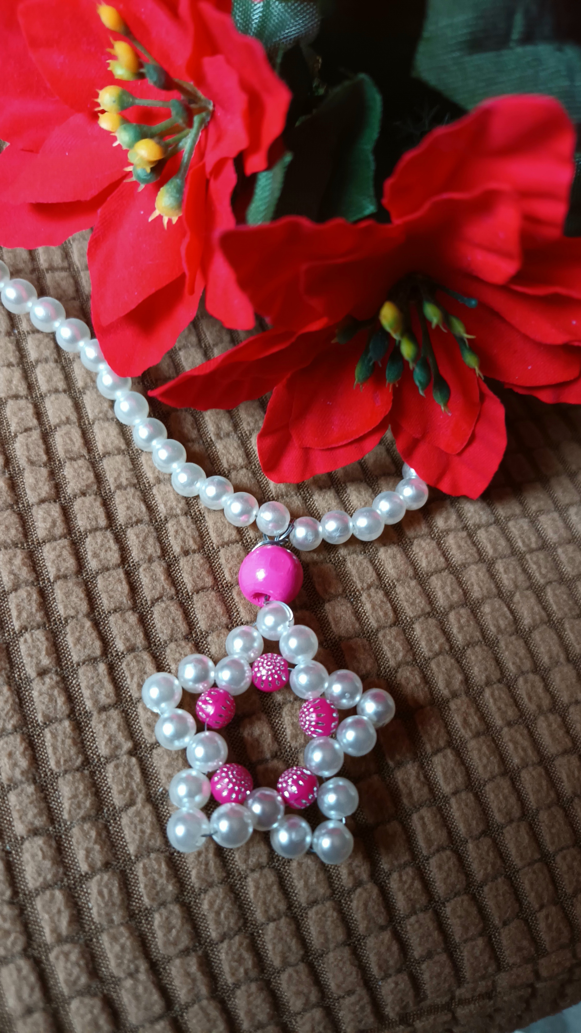 Come primo passaggio, tagliamo un tratto di filo di ferro e iniziamo ad infilare ad una ad una 4 perline bianche e le 5 perline fucsia glitterate, alternandole tra di loro ( 1 bianca, 1 fucsia glitterata, 1 bianca e così via…). Una volta completata questa sequenza, infiliamo su un’estremità di filo 1 perlina bianca e facciamo passare l’altra estremità attraverso quest’ultima perlina appena infilata. Dopo aver tirato bene i fili, la base della nostra stella è terminata. A questo punto non ci resta che realizzare le cinque punte. Inseriamo quindi su un’estremità di filo 3 perline bianche e facciamo passare questa parte di filo nella prima perlina bianca della base della stella che incontriamo. Seguiamo la stessa procedura per creare le altre tre punte della nostra stella. Per realizzare, invece, la quinta e ultima punta, inseriamo 1 perlina bianca su un’estremità di filo e 2 perline bianche sull’altra estremità. Incrociamo i fili, facendo passare l’estremità di filo con una perlina nella seconda perlina inserita dell’altra estremità e tiriamo bene. Infine inseriamo la nostra perla grande fucsia e creiamo, con l’aiuto delle pinze a punta arrotondata, un’asola che andremo a fissare con una serie di avvolgimenti dei fili. Tagliamo con le forbici le eccedenze e il nostro ciondolo è pronto.