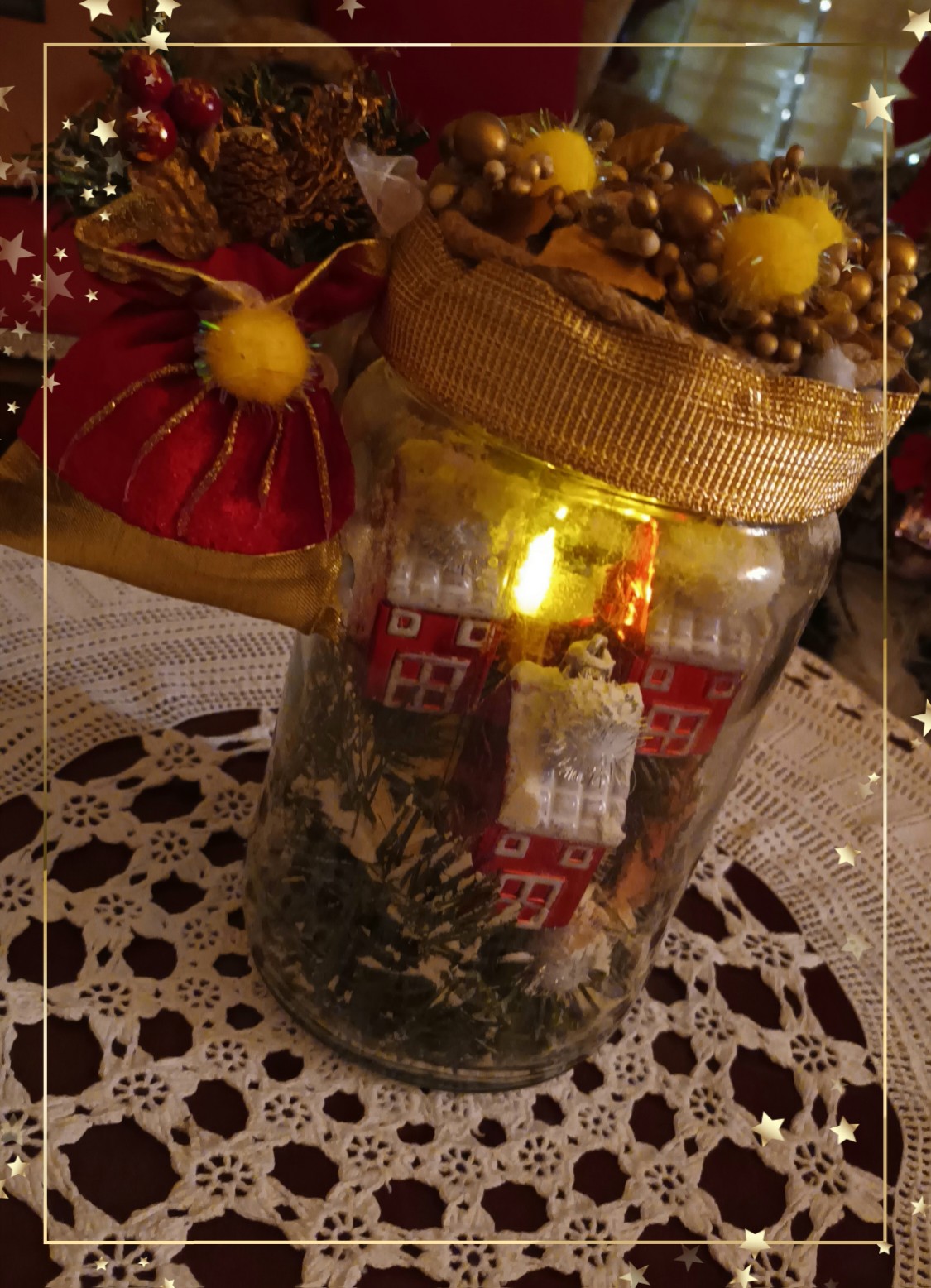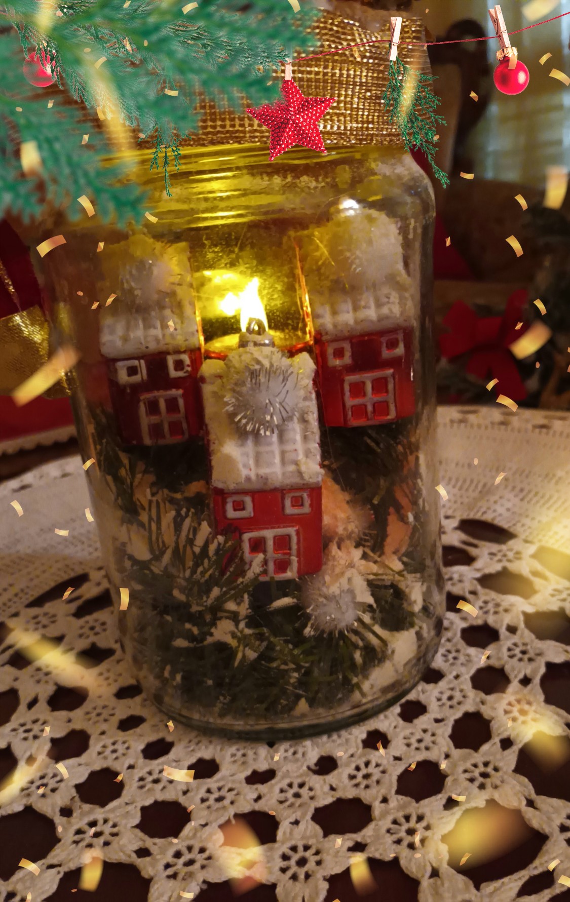 Con l’arrivo del mese di dicembre, le nostre case si riempiono di tante luci e decorazioni in attesa della festa più importante dell’anno: il Natale. Anche noi, nel nostro piccolo, possiamo creare con le nostre mani dei graziosi e incantevoli oggetti decorativi che richiamano a questa suggestiva ricorrenza. Tra le molte idee che mi sono venute in mente, ho scelto di proporvi quella del vasetto di vetro che vedete in foto. Un giorno, infatti, mettendo a posto alcuni utensili ed oggetti lasciati in giro qua e là in cucina, mi è capitato di ritrovare per caso questo vaso di vetro alto e capiente. Allora mi sono detta: “Perché non rinnovarlo e utilizzarlo come ornamento natalizio?”. E così ho fatto. Come prima cosa l’ho riempito di tanti piccoli rametti verdi di un vecchio alberello di natale che non utilizzavo più. Poi mi sono recata nel mio negozio di hobbistica preferito e ho scelto queste piccole e adorabili casette rosse, dei pon pon bianchi e un piccolo lumino a intermittenza.