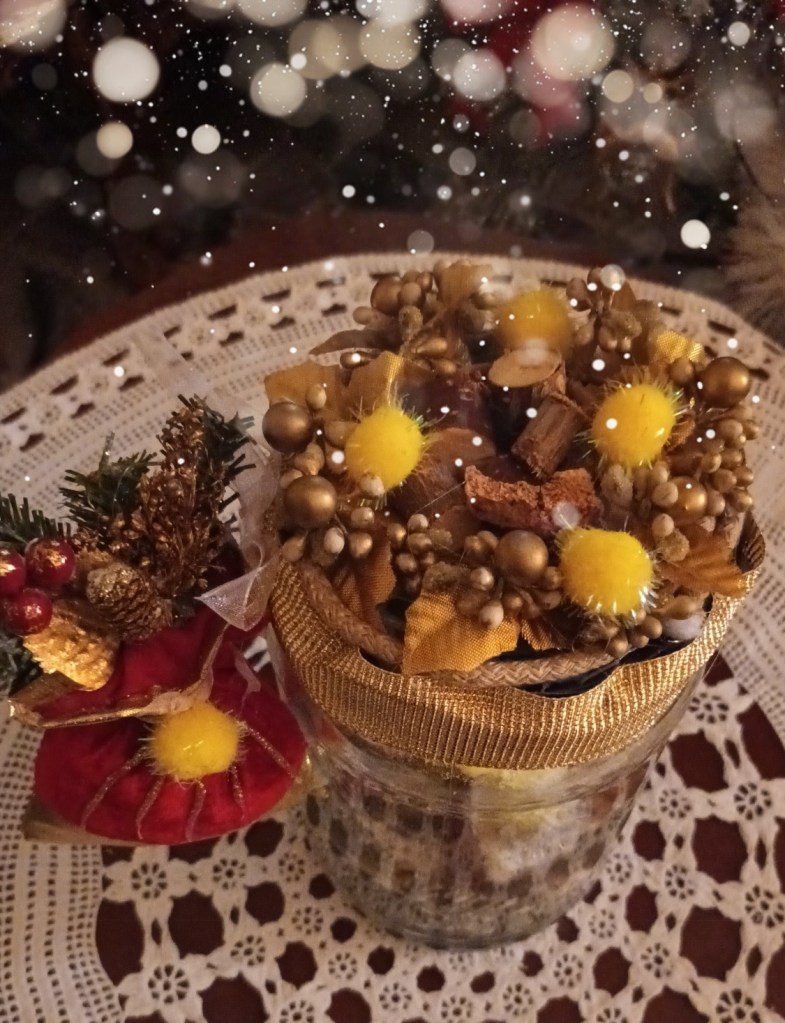 A questo punto non mi restava che abbellire il coperchio del mio vaso. Ho recuperato così un po’ di nastro dorato avanzato, che ho incollato intorno al bordo sempre con l’aiuto della colla a caldo mentre al centro ho inserito una piccola ghirlanda natalizia di colore oro e dei legnetti rimasti da un vecchio presepe. Infine, dopo aver rimesso il coperchio al mio vasetto, l’ultimo tocco è stato quello di aggiungere con la colla a caldo sul lato sinistro del vaso un simpatico ed elegante sacchetto di velluto rosso con inserti natalizi e dorati. E questo è stato il risultato:
