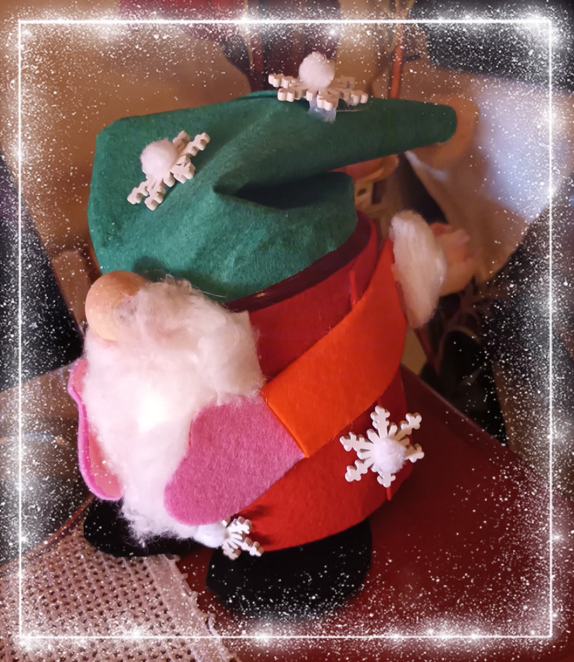 Tutte le parti del nostro gnometto sono pronte, quindi non ci resta che assemblarle tra di loro. Avvitiamo il tappo con il cappello a punta di feltro verde al vasetto, applichiamo con la colla a caldo le braccia rivestite di feltro arancione e decorate in alto con del cotone bianco e le manine rivestite di feltro rosa, mentre alla base del vasetto posizioniamo i piedini rivestiti di feltro nero. Infine incolliamo la barbetta bianca di cotone e, in alto su quest’ultima, la pallina di legno leggermente colorata di rosso con un pizzico di fard per il nasino.
