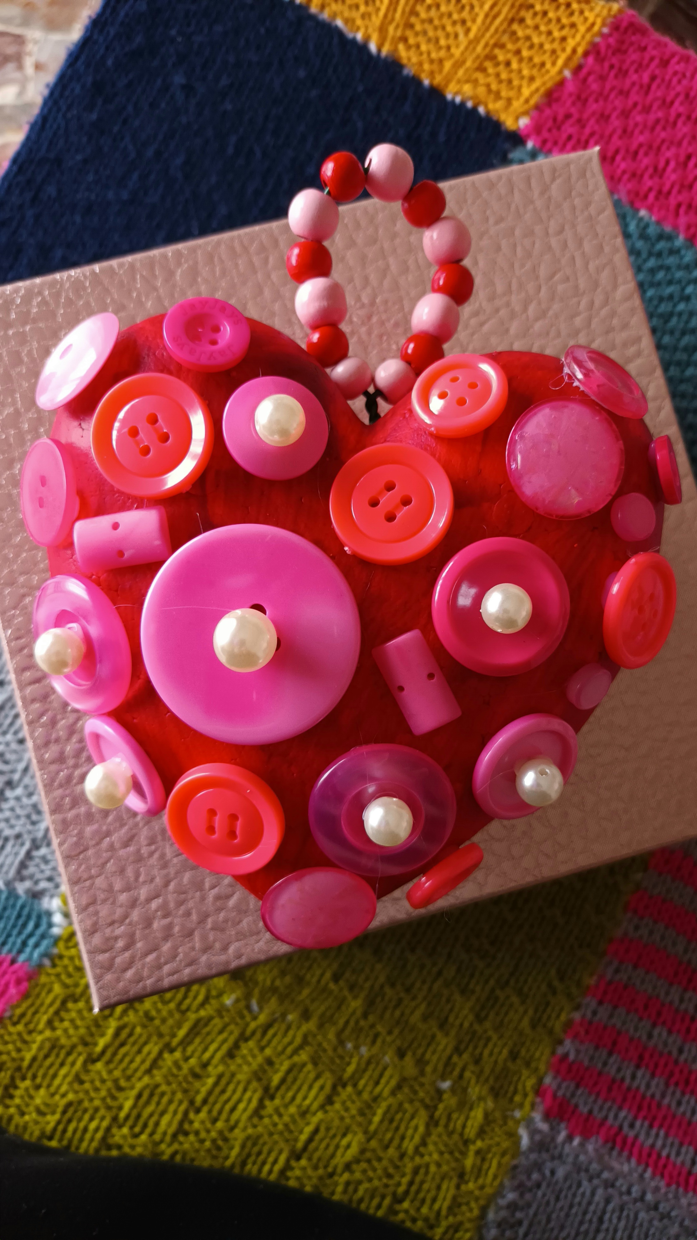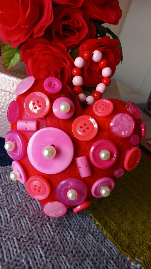 Dopo aver procurato tutto l’occorrente, ho preso e steso su un tavolo un foglio di giornale, ho aperto il mio tubetto di pittura e, con il pennello, ho iniziato a dipingere tutto il mio cuore di polistirolo di questa bella tonalità di rosso scuro. Una volta fatto asciugare per bene, con l’aiuto della colla a caldo l’ho riempito di bottoni rossi e rosa sia grandi sia piccoli e, su alcuni di essi, ho anche applicato le perle bianche medie e grandi per donargli un tocco più chic e ricercato.