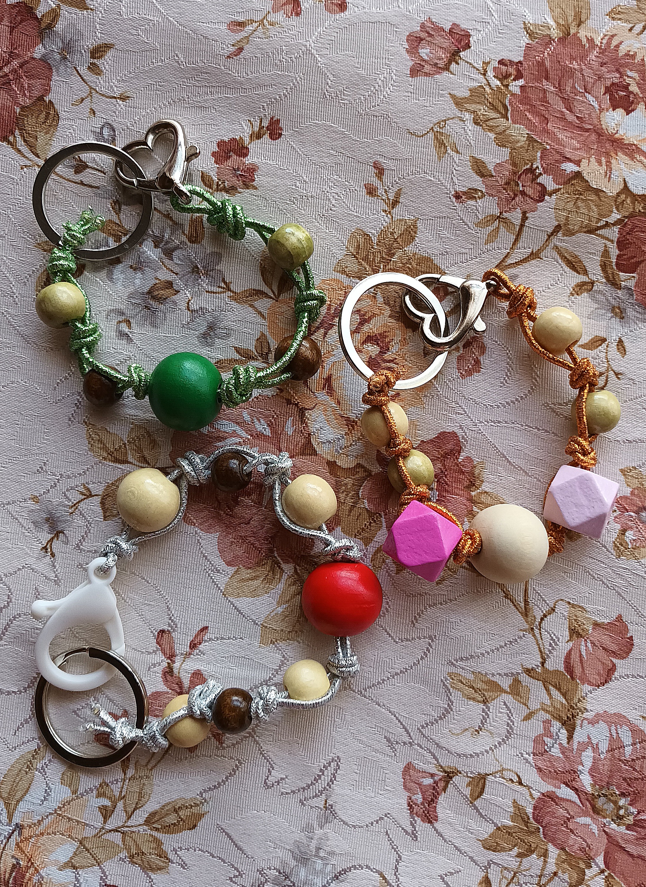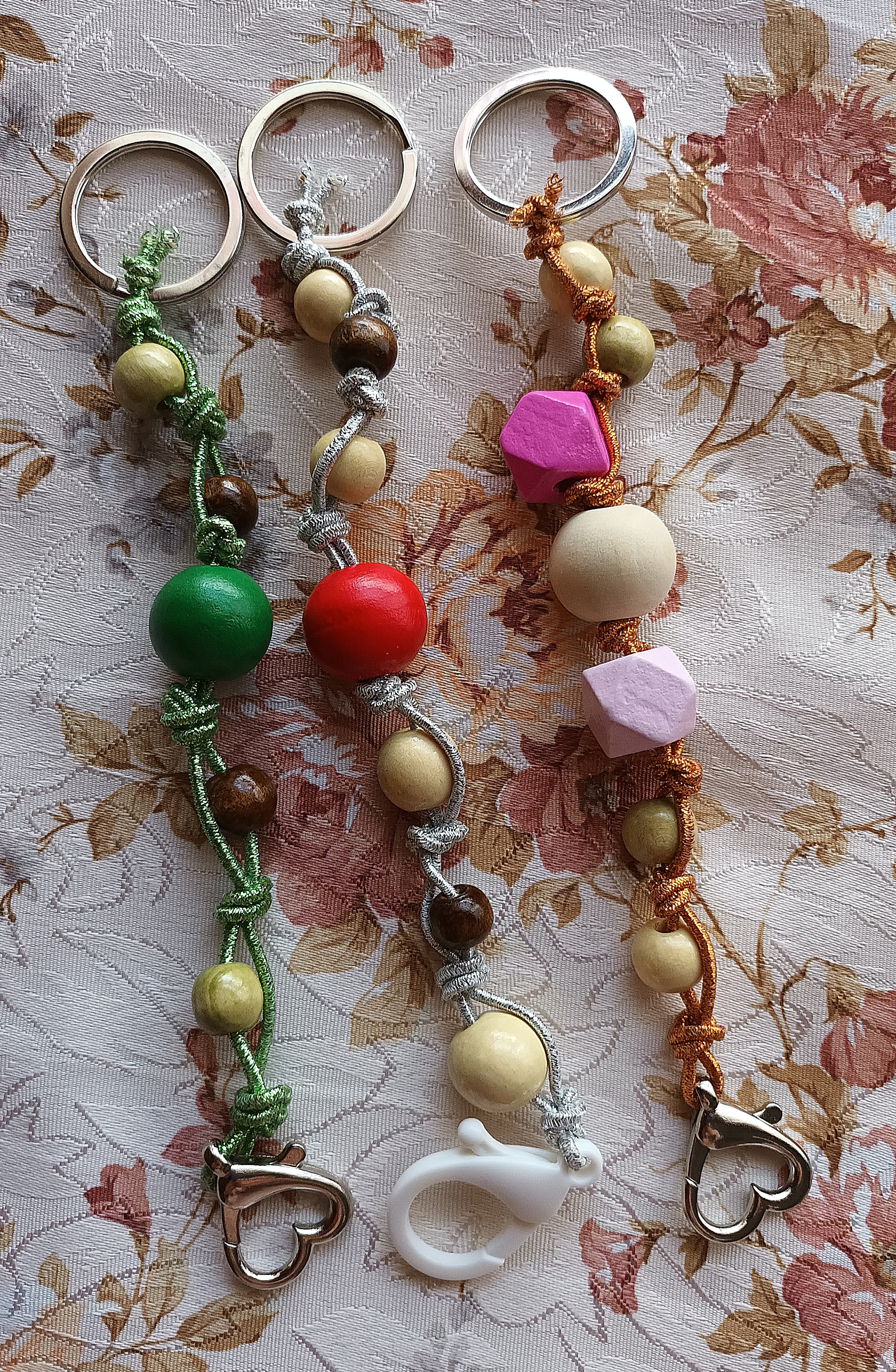 Una volte pronte con tutto il necessario, prendiamo uno dei nostri pezzetti di corda e infiliamo un moschettone a nostra scelta. Portiamo il moschettone al centro del cordoncino e fissiamolo con un doppio nodo. Inseriamo una perlina più piccola sulla parte di cordoncino a destra del moschettone e fissiamola con un doppio nodo. Infiliamo poi una perlina di media grandezza sulla parte di cordoncino a sinistra del moschettone e fissiamola con un doppio nodo. Proseguiamo con l’inserire una perlina più grande di nuovo sulla parte di cordoncino a destra del moschettone e fissiamola con un doppio nodo. Procediamo sempre in questo modo fino ad ottenere la lunghezza da noi desiderata. Infine terminiamo il lavoro inserendo l’anello per portachiavi, fissandolo con un doppio nodo e tagliando con le forbici le eccedenze di cordoncino.