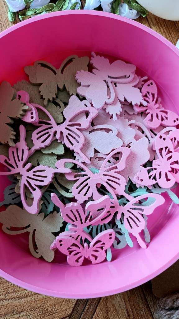 - sagomine di legno di colore verde e rosa a forma di farfalla
