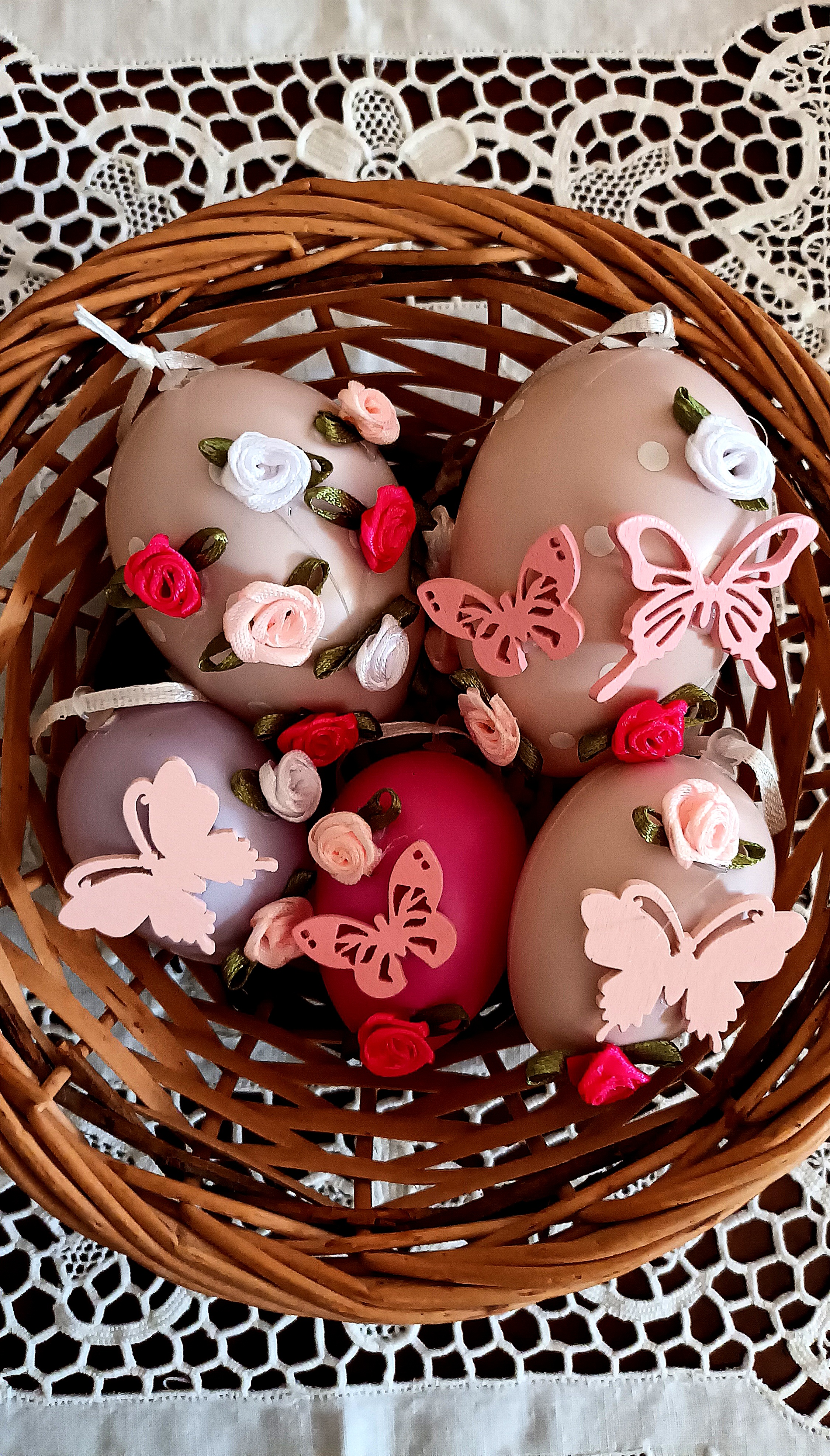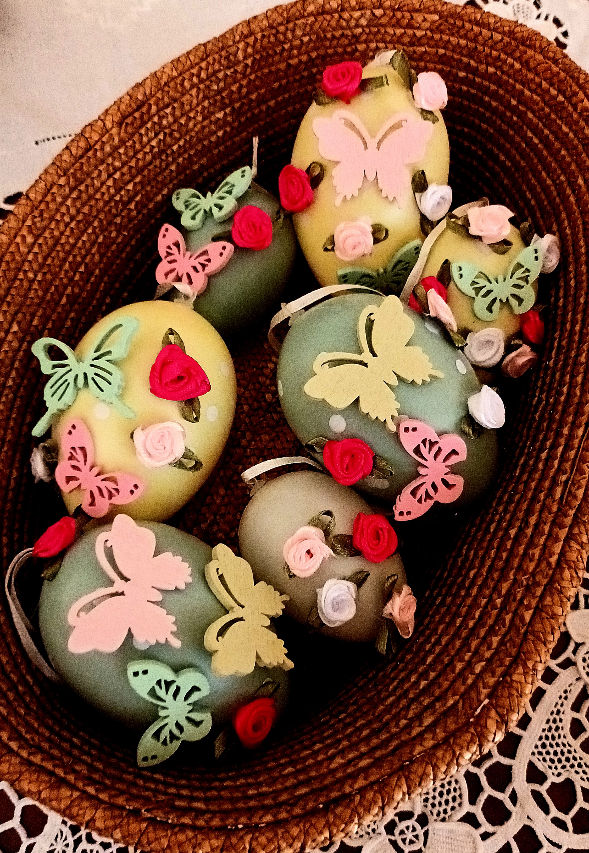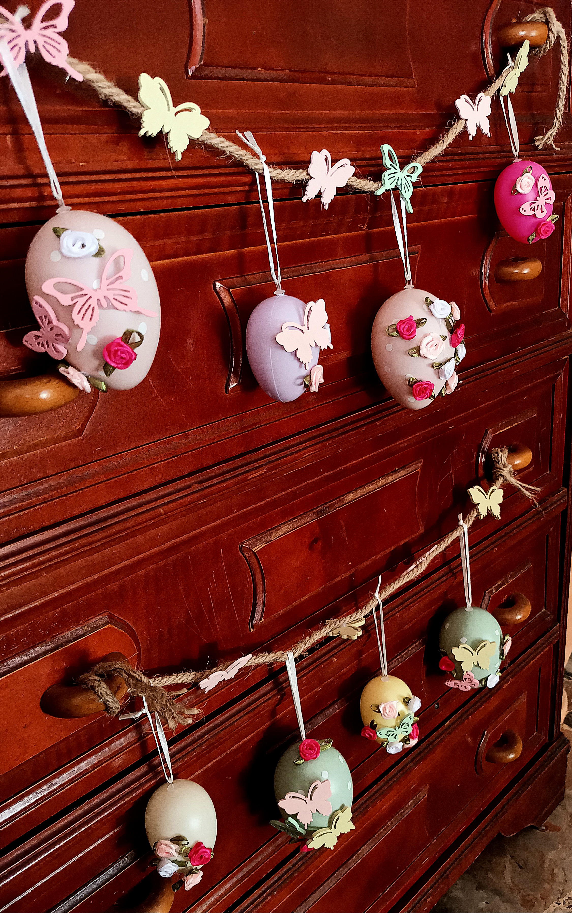 Una volta procurato tutto il necessario, applichiamo a nostro piacimento le sagomine di legno delle farfalle e i fiorellini di stoffa sulle nostra uova colorate con l’aiuto della colla a caldo. Completate tutte le uova, possiamo scegliere se appenderle alle finestre, alle pareti, ai pomelli di un cassetto, alle maniglie delle ante di un mobile o alla porta d’ingresso, utilizzando il filo di corda decorato dalle nostre farfalline di legno, in modo da creare delle deliziose ghirlande.