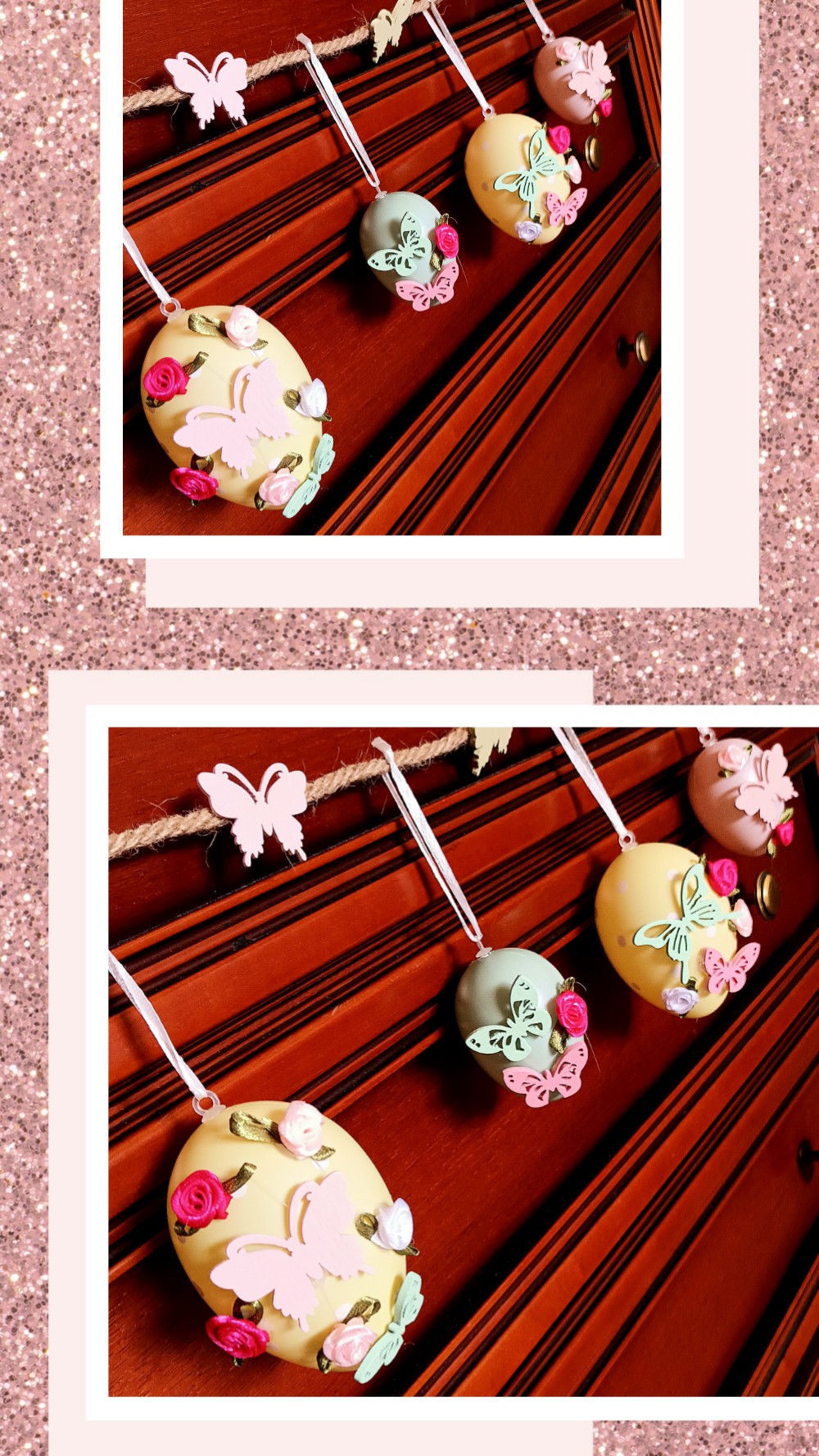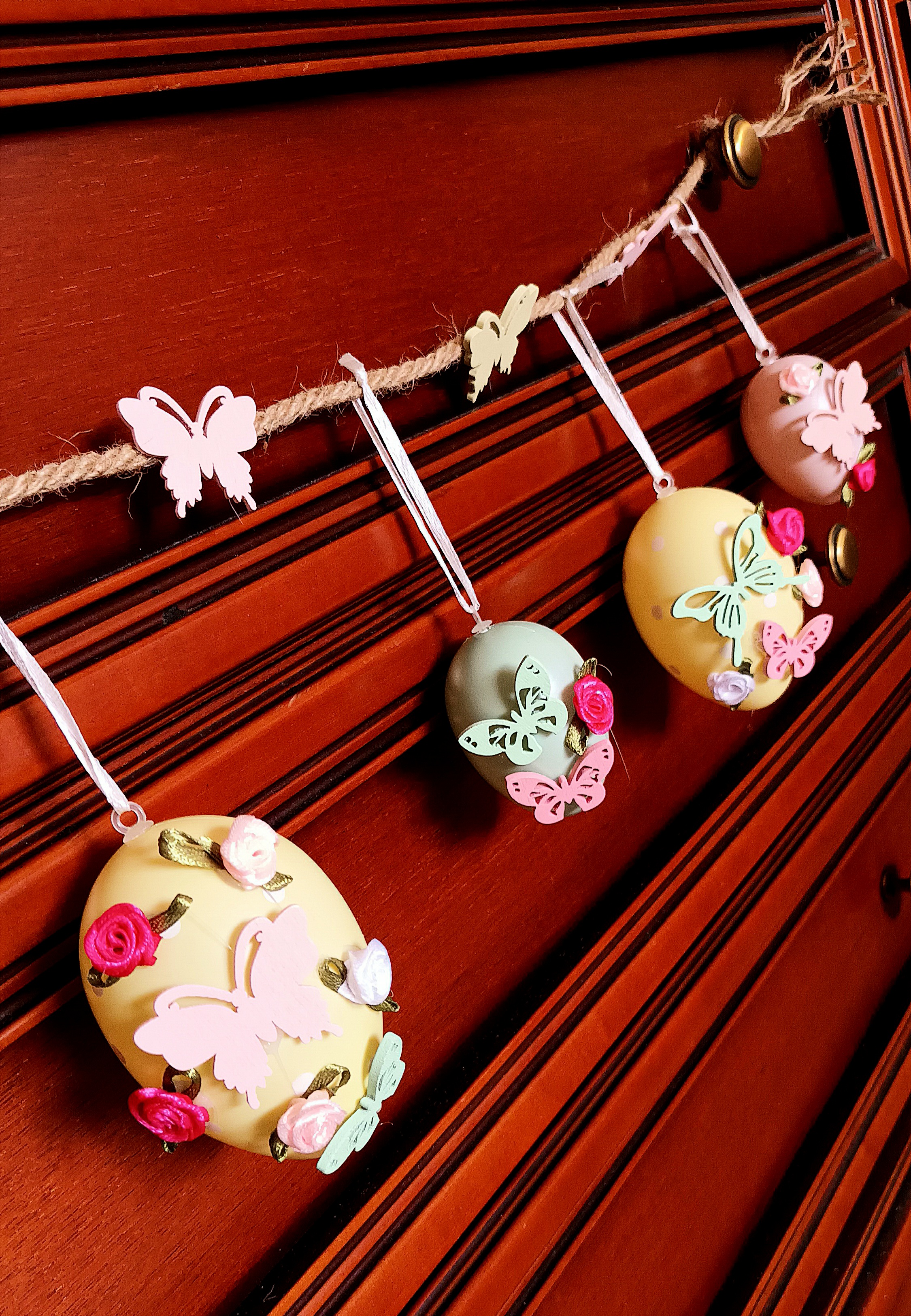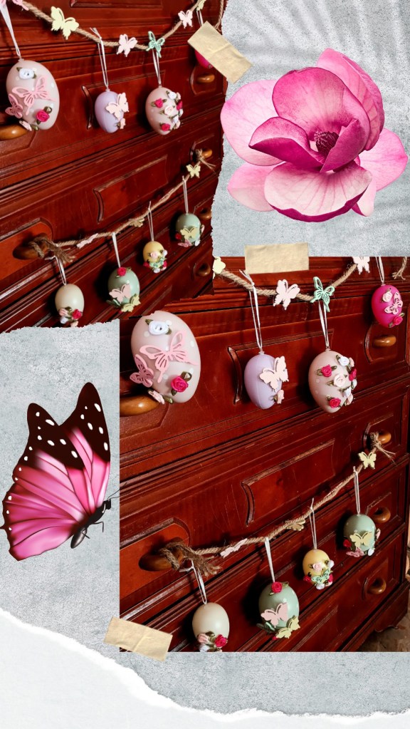 Una volta procurato tutto il necessario, applichiamo a nostro piacimento le sagomine di legno delle farfalle e i fiorellini di stoffa sulle nostra uova colorate con l’aiuto della colla a caldo. Completate tutte le uova, possiamo scegliere se appenderle alle finestre, alle pareti, ai pomelli di un cassetto, alle maniglie delle ante di un mobile o alla porta d’ingresso, utilizzando il filo di corda decorato dalle nostre farfalline di legno, in modo da creare delle deliziose ghirlande.