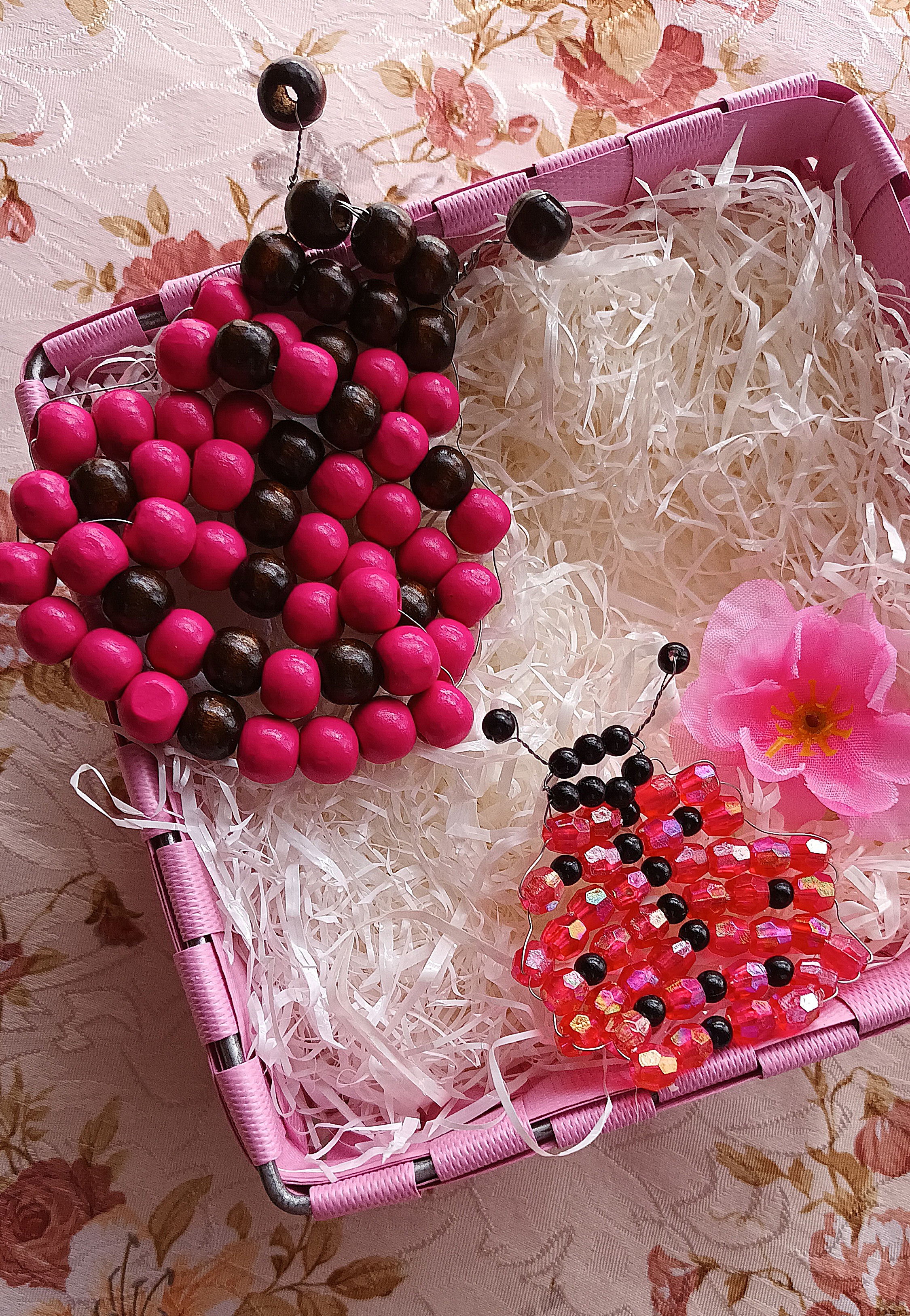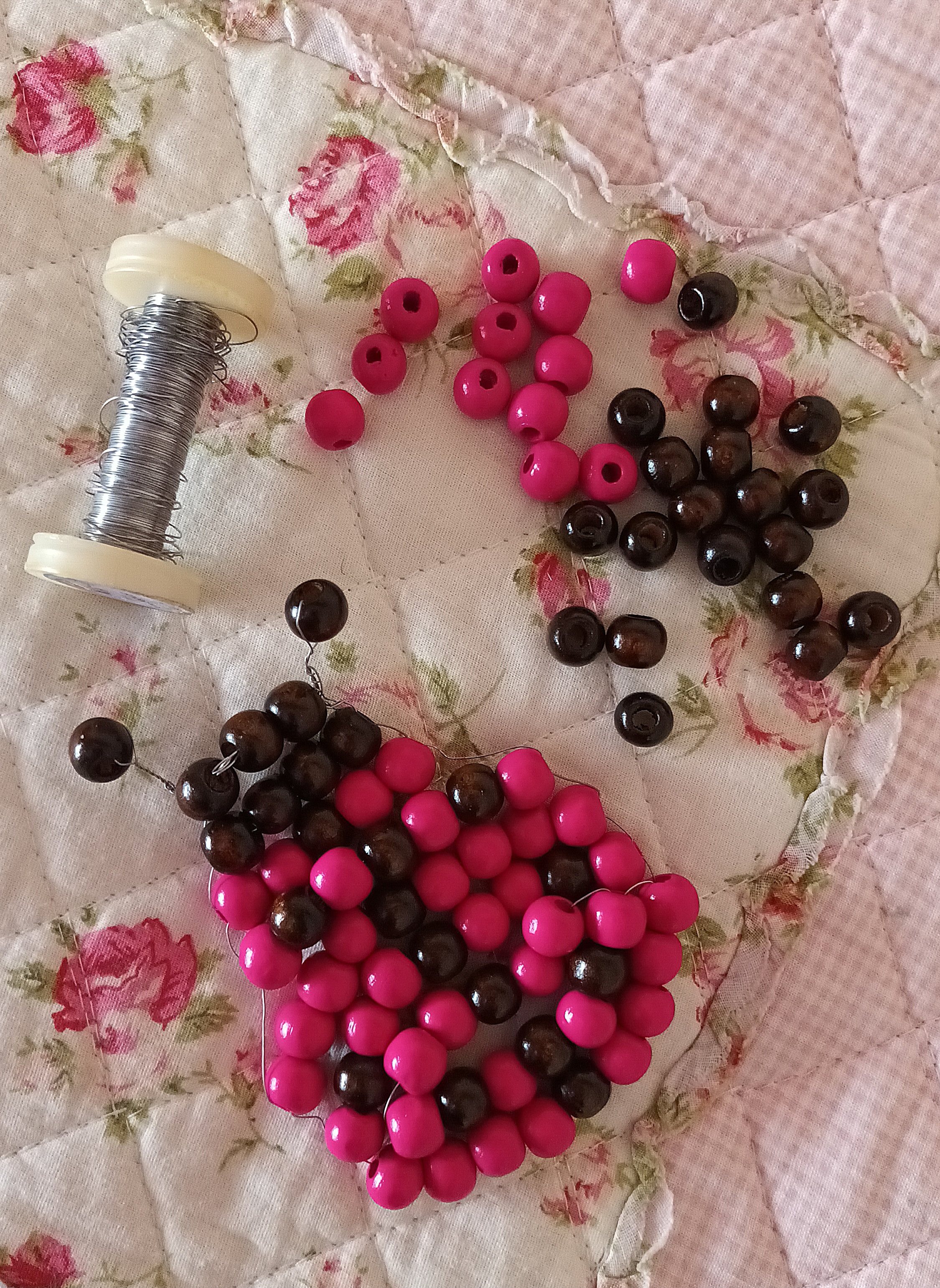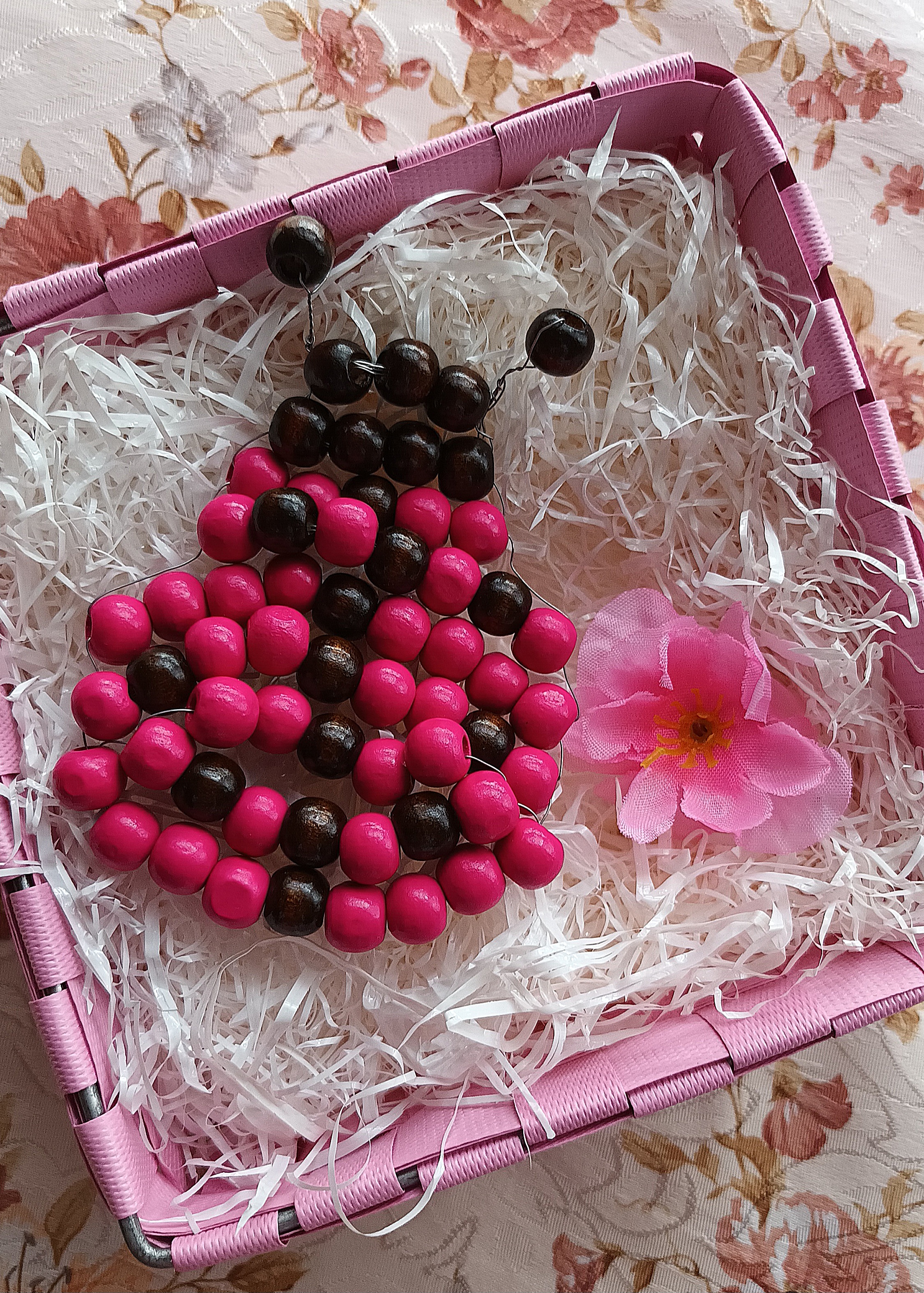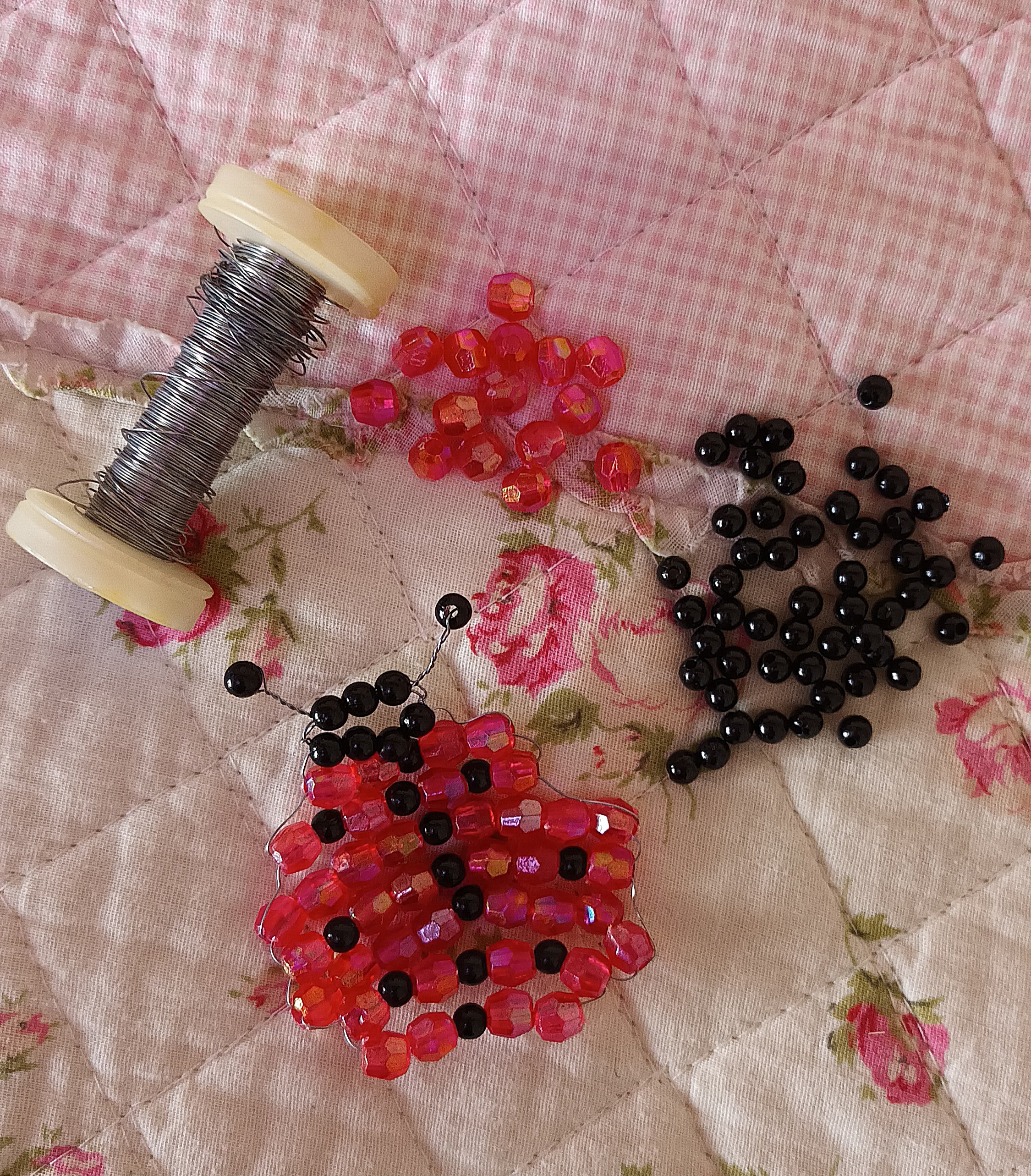 Per la creazione della coccinella più grande, non dovete fare altro che seguire la stessa procedura e gli stessi passaggi svolti per la coccinella più piccola, utilizzando però circa 1 mt di filo di rame e sostituendo i cristalli rossi con le perle di legno fucsia e le perline nere con le perle di legno marrone scuro.