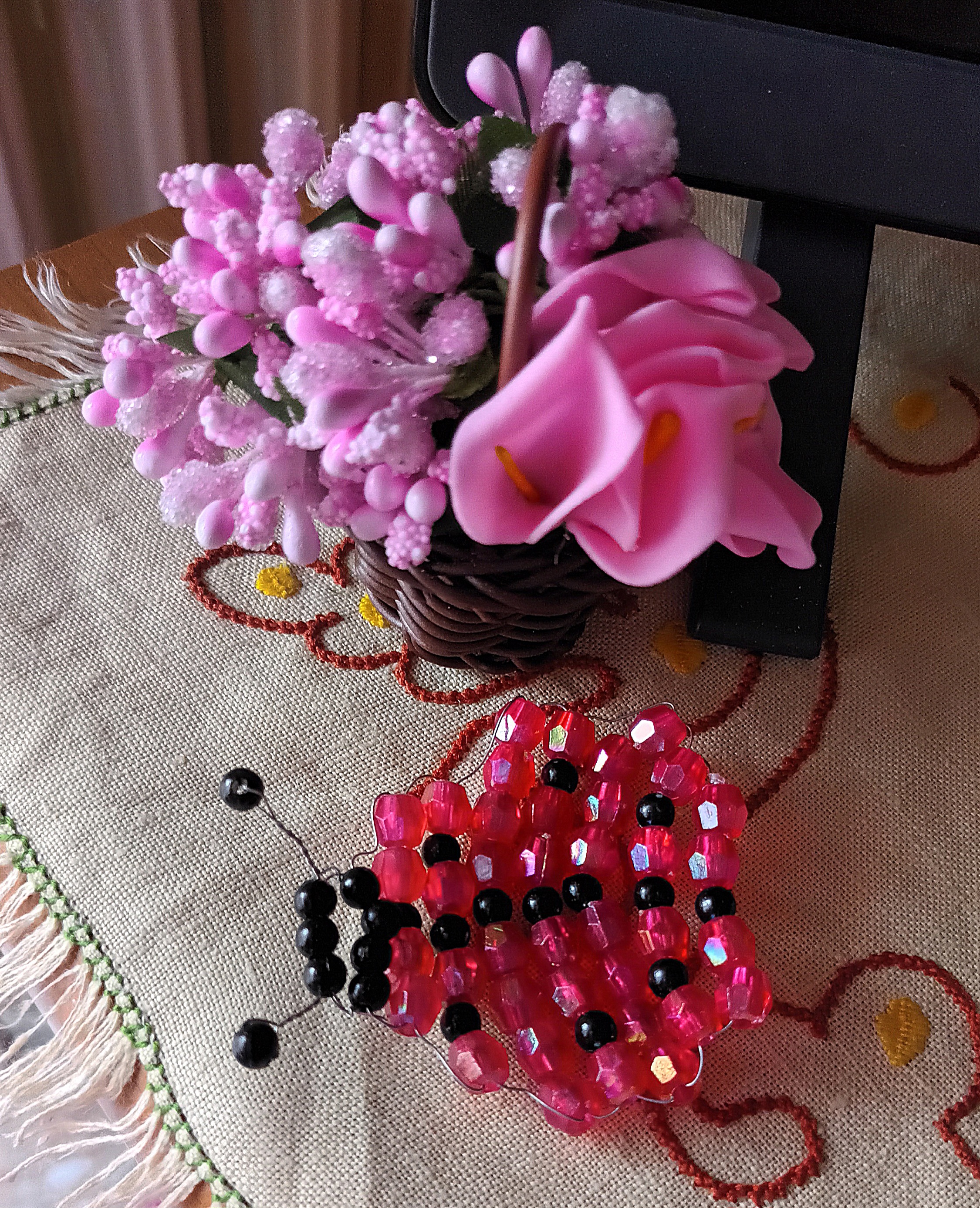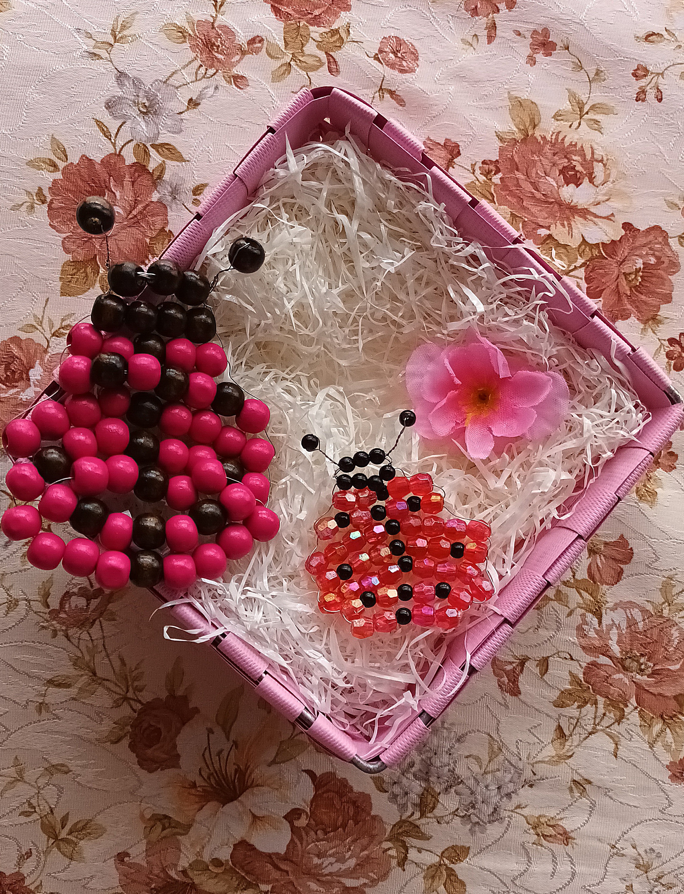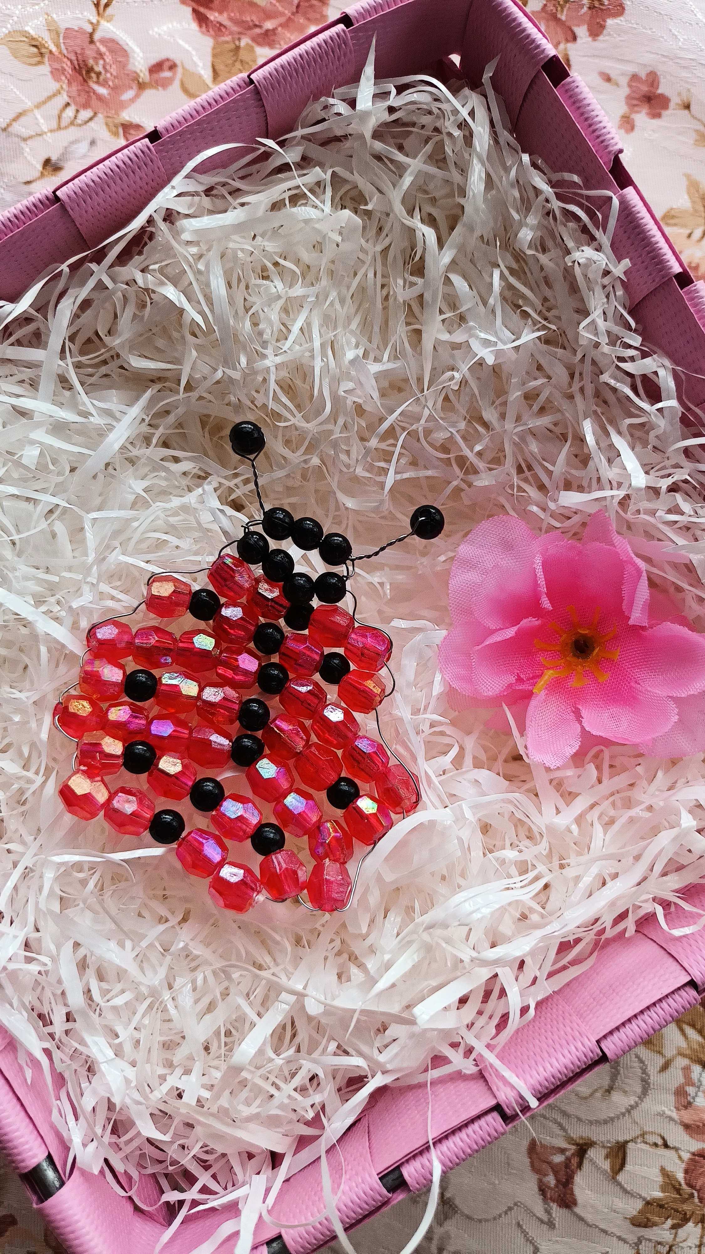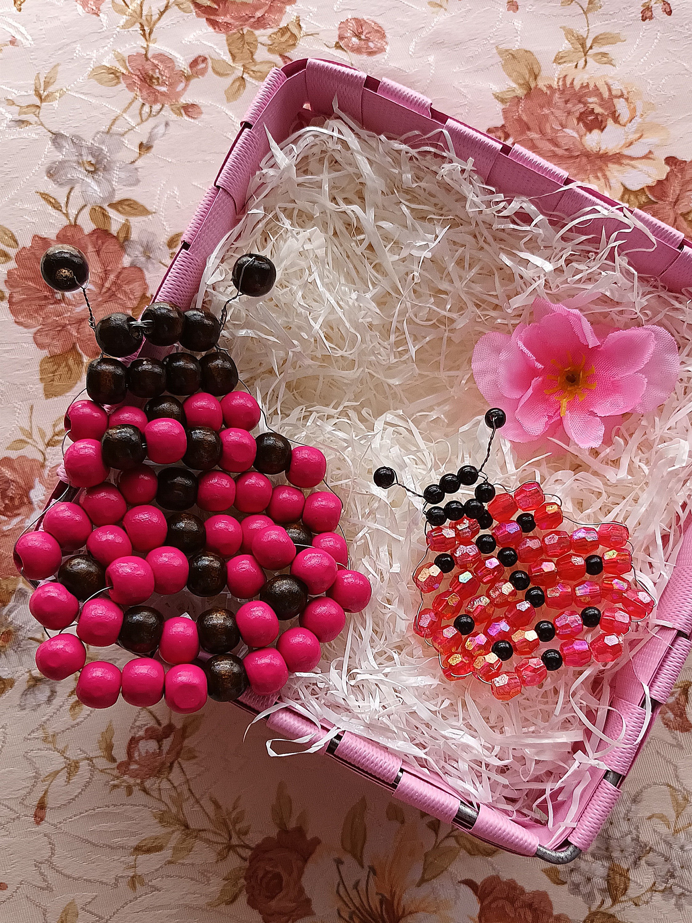 Per la creazione della coccinella più grande, non dovete fare altro che seguire la stessa procedura e gli stessi passaggi svolti per la coccinella più piccola, utilizzando però circa 1 mt di filo di rame e sostituendo i cristalli rossi con le perle di legno fucsia e le perline nere con le perle di legno marrone scuro.