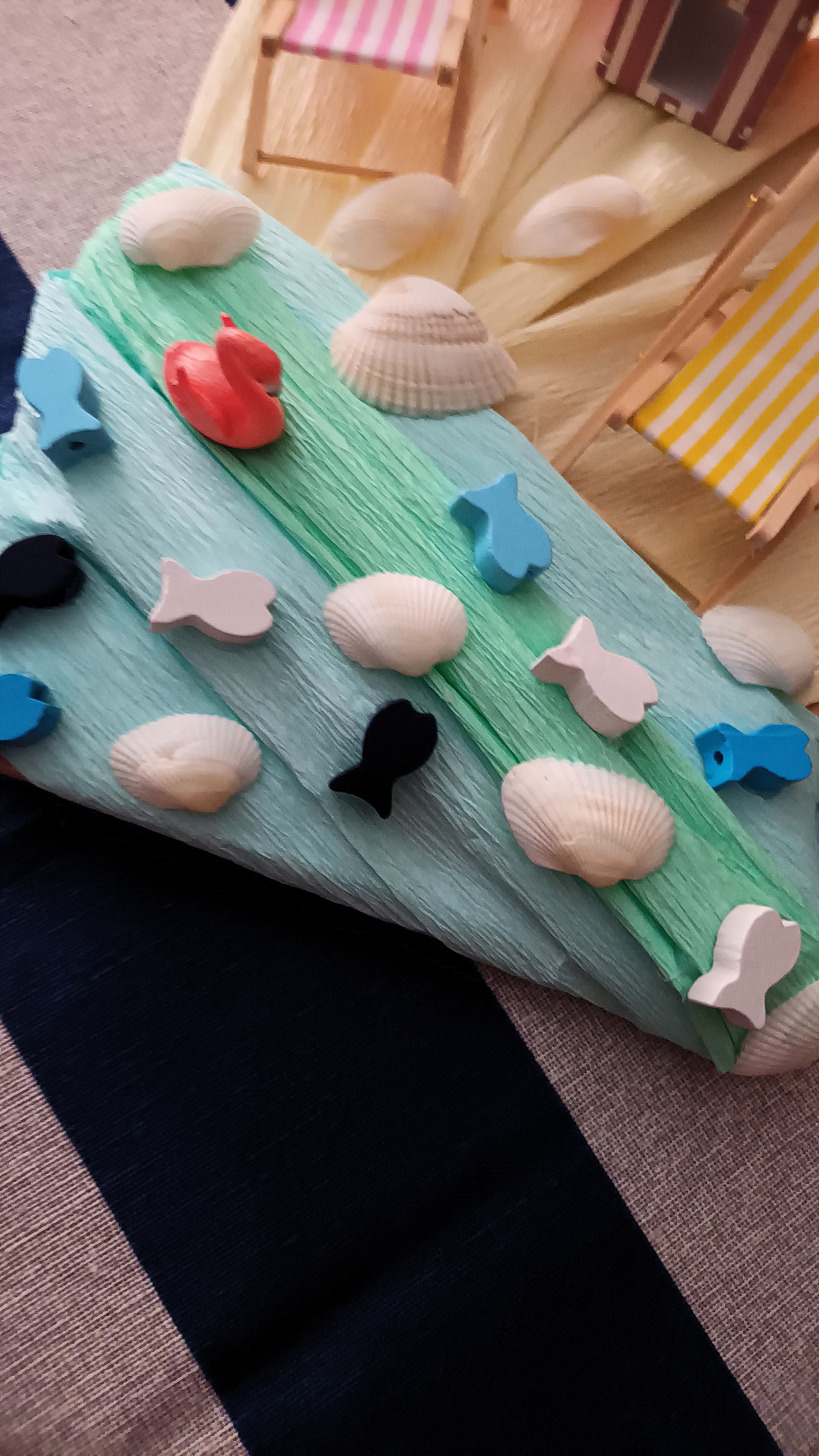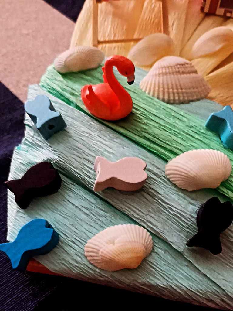 Continuiamo poi la nostra creazione, incollando sulla parte della base rivestita di carta crespa di colore azzurro e verde chiaro, tanti pesciolini di legno colorati di bianco, di blu, di azzurro chiaro e scuro, altre conchiglie di varia grandezza e il nostro piccolo fenicottero rosa.