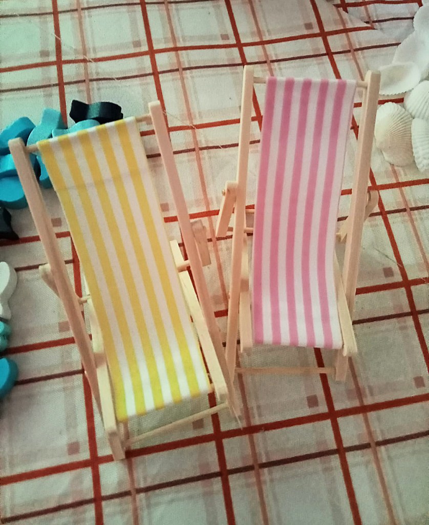 - 2 piccole sedie a sdraio di legno e stoffa
