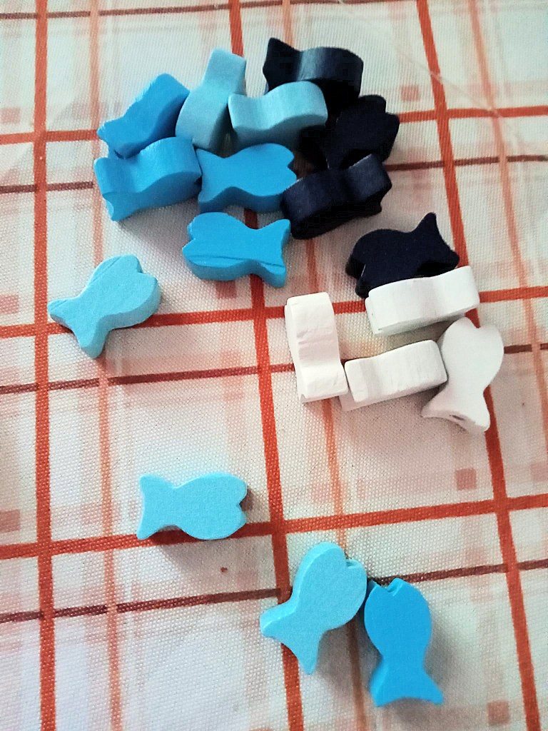 - pesciolini di legno sulle tonalità del bianco, dell’azzurro chiaro e scuro e del blu