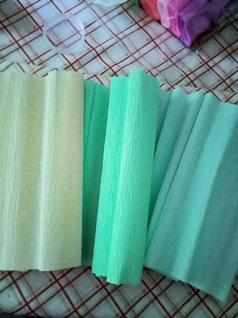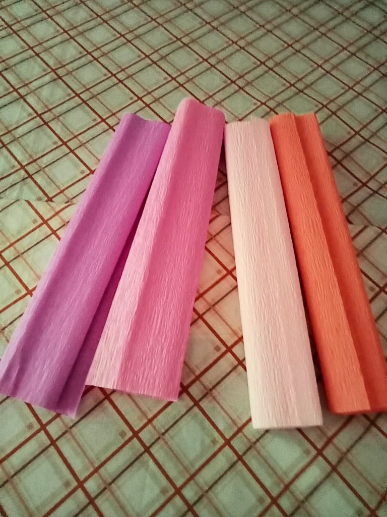 - 4 fogli di carta crespa di colore lilla, rosa confetto, rosa chiaro e arancione per gli ombrellini