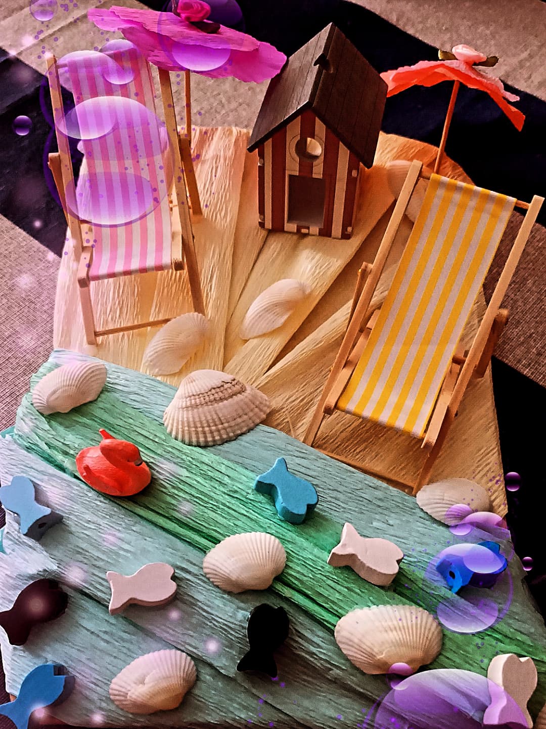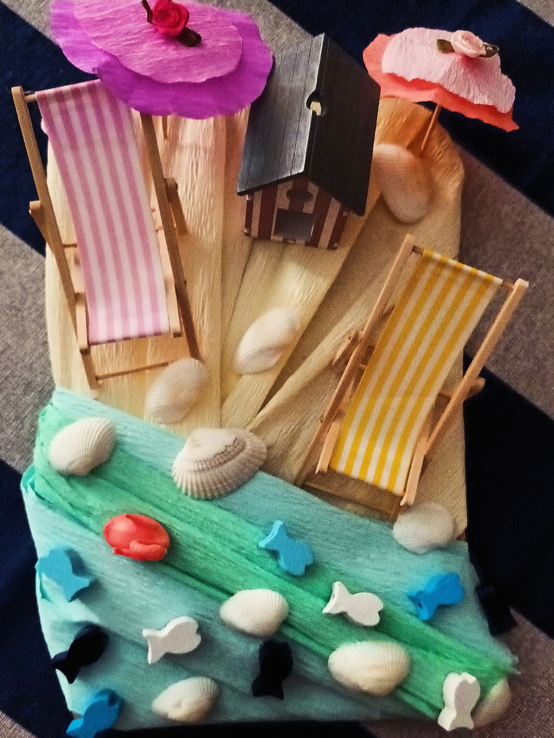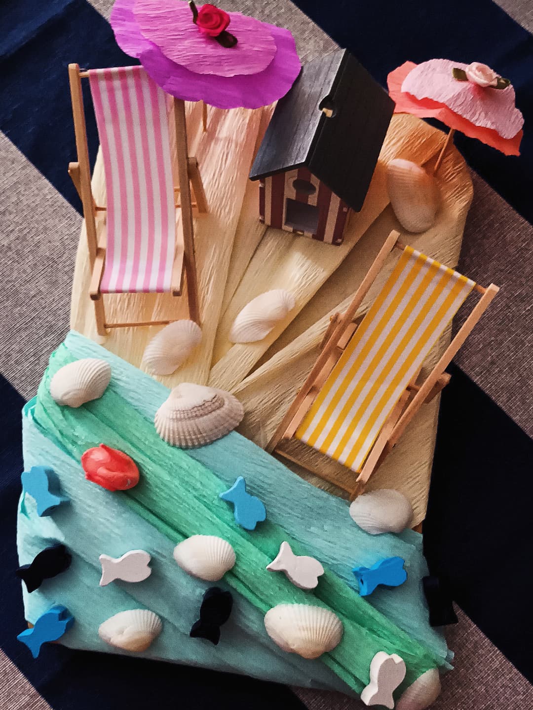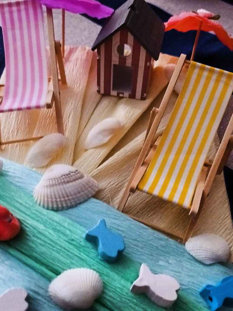 Una volta procurato tutto l’occorrente necessario, iniziamo la nostra creazione prendendo la base di legno rettangolare e rivestendola, con l’aiuto della colla a caldo, per una metà di carta crespa di colore giallo chiaro per la sabbia e per l’altra metà di carta crespa di colore azzurro e verde chiaro per il mare. Non appena completata la nostra base di legno, sempre con l’aiuto della colla a caldo, incolliamo sulla parte rivestita di carta crespa di colore giallo chiaro, la cabina balneare, le due sedie a sdraio e tante conchiglie di varia grandezza. Proseguiamo quindi il nostro lavoro, passando alla realizzazione degli ombrellini. Disegniamo e ritagliamo su ciascun foglio di carta crespa di colore lilla e arancione un cerchio più grande, invece su ciascun foglio di carta crespa di colore rosa confetto e rosa chiaro un cerchio più piccolo. Una volta pronti i nostri quattro cerchi, ripieghiamo più volte a metà ciascuno su se stesso in modo da ricreare, dopo averli riaperti, le stecche degli ombrelli e, con l’aiuto della colla a caldo, incolliamo il cerchio piccolo rosa confetto sul cerchio grande lilla e il cerchio piccolo rosa chiaro sul cerchio grande arancione. Se volete, potete abbellire la sommità dei vostri ombrellini anche con dei piccoli fiorellini di stoffa. Infine incolliamo ciascuno dei due tettucci dei nostri ombrellini su uno stuzzicadenti di legno, dopo averne tagliato con le forbici le estremità appuntite. Adesso i nostri ombrellini sono completi e pronti per essere inseriti dove più ci piace.