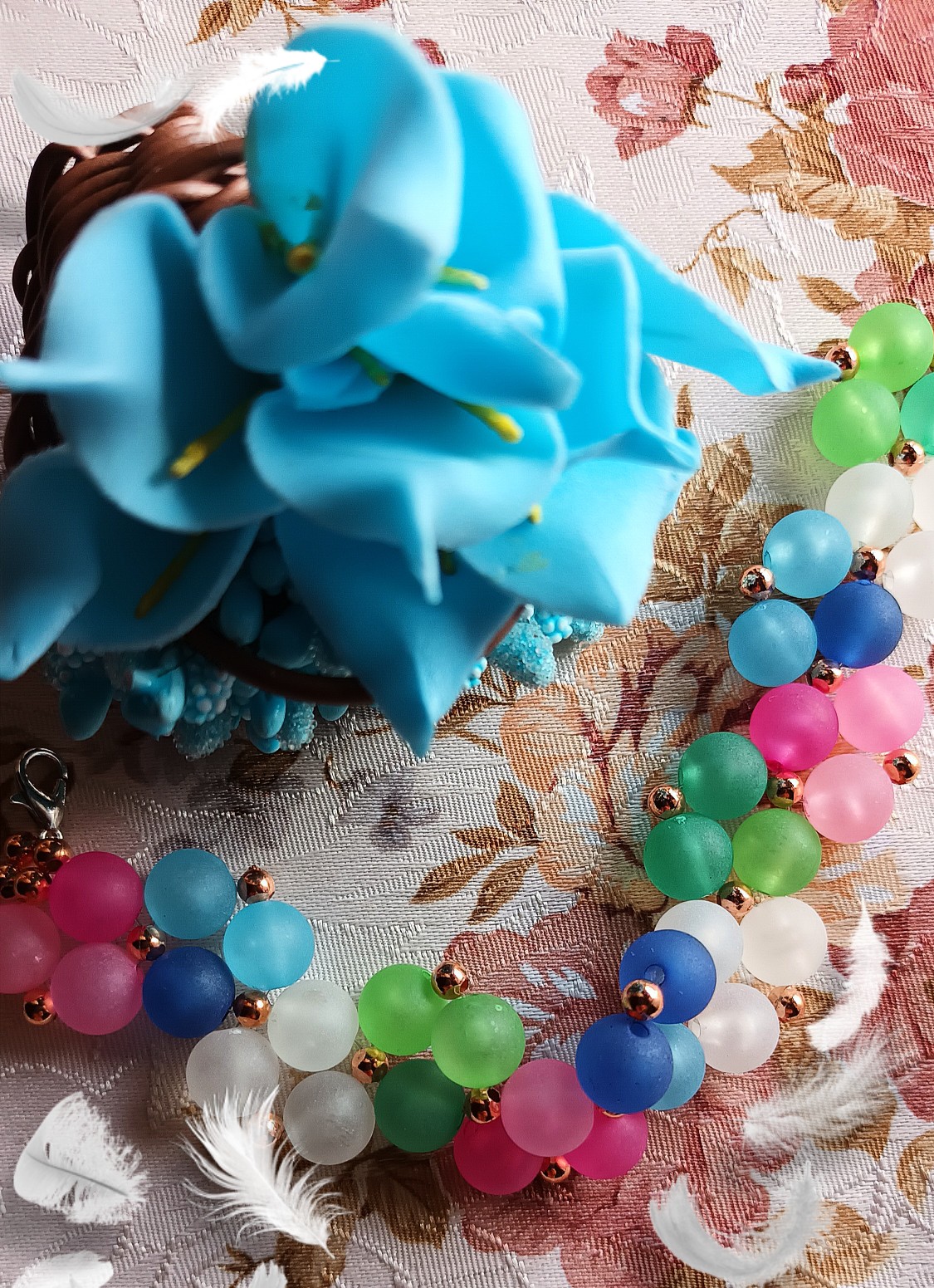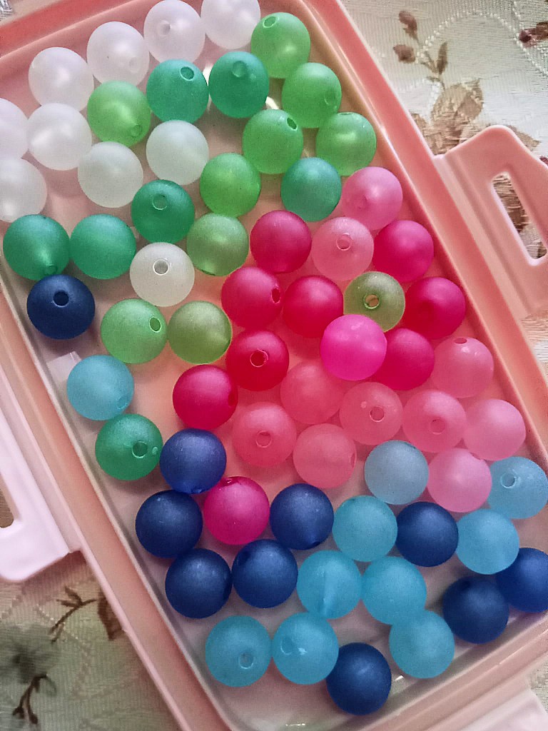 - 5 perline opache di colore rosa, 4 perline opache di colore fucsia, 5 perline opache di colore azzurro, 4 perline opache di colore blu, 9 perline opache di colore bianco, 5 perline opache di colore verde chiaro, 4 perline opache di colore verde scuro