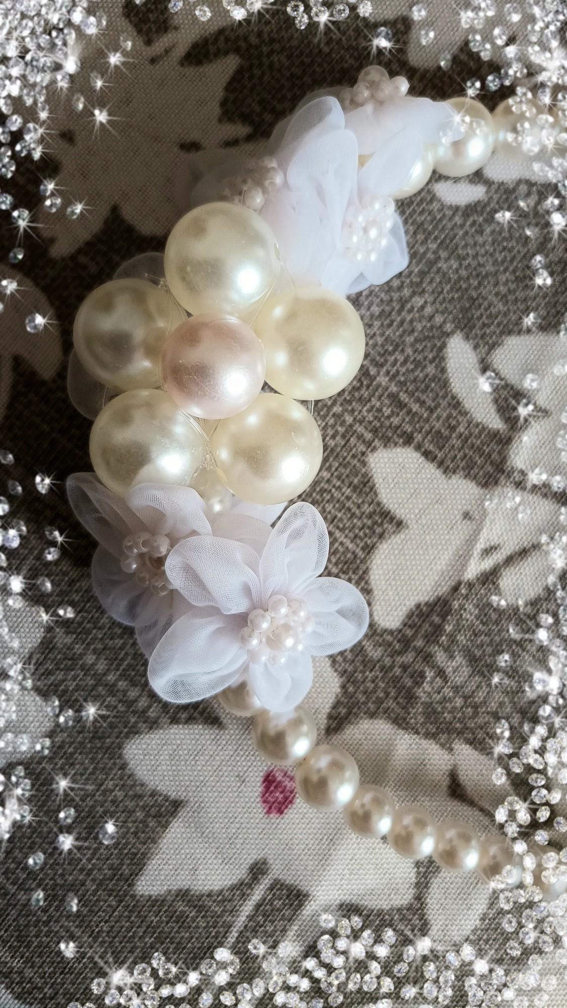 Avete procurato tutto il necessario? Benissimo! Ora possiamo finalmente partire con la realizzazione del fiore di perle che useremo come applicazione per il nostro cerchietto. Tagliamo un tratto di circa 40 cm di filo elastico e infiliamo 5 perle bianche, che andremo poi a bloccare e a fissare con un doppio nodo dei fili, in modo da ottenere la base del fiore. Inseriamo poi su uno dei due fili 1 perla bianca e facciamo passare all’interno di quest’ultima l’altro filo, tirando bene. Incrociamo quindi i due fili nella perla bianca corrispondente alla parte opposta di dove stiamo lavorando (uno da sinistra verso destra e l’altro da destra verso sinistra), così da ottenere la parte centrale del nostro fiore. Infine nascondiamo i fili tra le perle, fermiamoli con un doppio nodo e con le forbici tagliamo le eccedenze. Ora, con l’aiuto della colla a caldo, incolliamo in alto su un lato del cerchietto il nostro fiore di perle appena terminato e alcuni dei fiori di tulle bianco a nostra disposizione, così da donare al nostro accessorio un effetto regale, luminoso e raffinato.