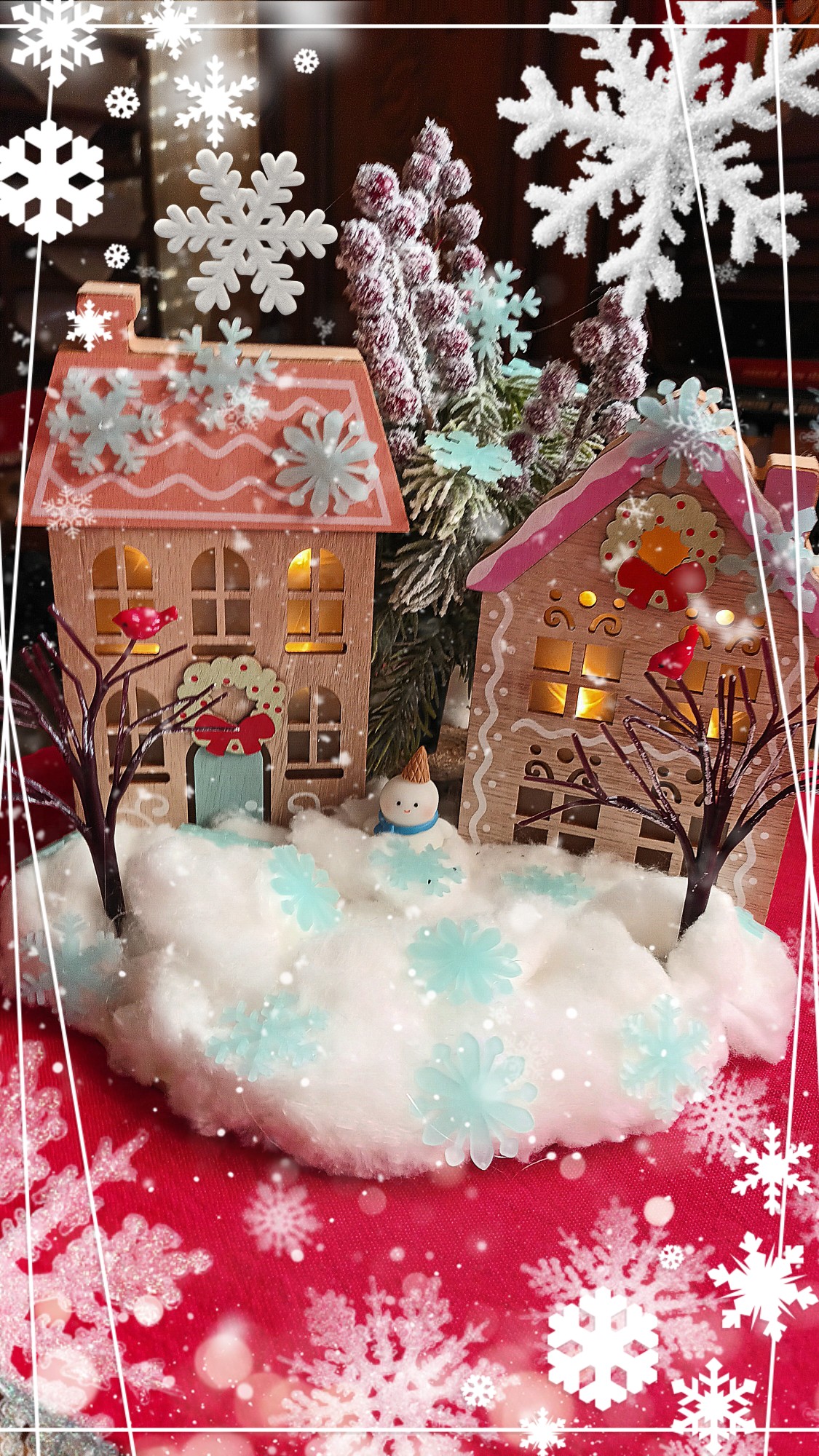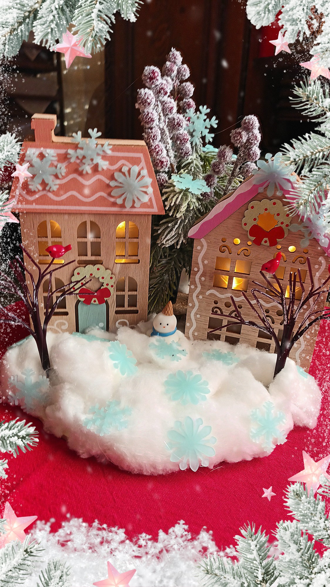 Una volta trovato tutto il necessario, prendete la base in legno compensato e con la colla a caldo iniziate ad inserire sul fondo il piccolo abete innevato con sopra i rametti di bacche di agrifoglio e ai suoi lati le due casette di legno dipinte. Proseguite poi con l’incollare al centro delle due casette il piccolo pupazzo di neve, mentre accanto a ciascuna di esse, posizionate un alberello di polistirolo. Ora non vi resta che ricoprire le parti della base di legno rimaste vuote con tanto cotone idrofilo, la cui consistenza soffice e leggera è ideale per imitare la neve naturale. Infine, sempre con l’aiuto della colla a caldo, cospargete il manto innevato appena ottenuto, le casette di legno e il piccolo abete di tanti fiocchetti di neve azzurri.