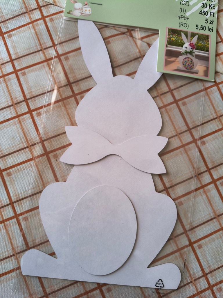 Una volta procurato tutto il necessario, iniziamo il lavoro dedicandoci alla decorazione della sagoma del coniglio. Scegliamo dal blocco tre fogli di carta decorati con motivi floreali e rivestiamo con ciascuno di essi il fiocco, l’uovo e le orecchie del nostro coniglietto. Applichiamo poi con la colla a caldo due piccoli bottoni neri per gli occhietti e uno sticker a forma di cuore per il musetto. Infine abbelliamo il nostro coniglietto con qualche fiorellino adesivo, come nella foto qui di seguito.