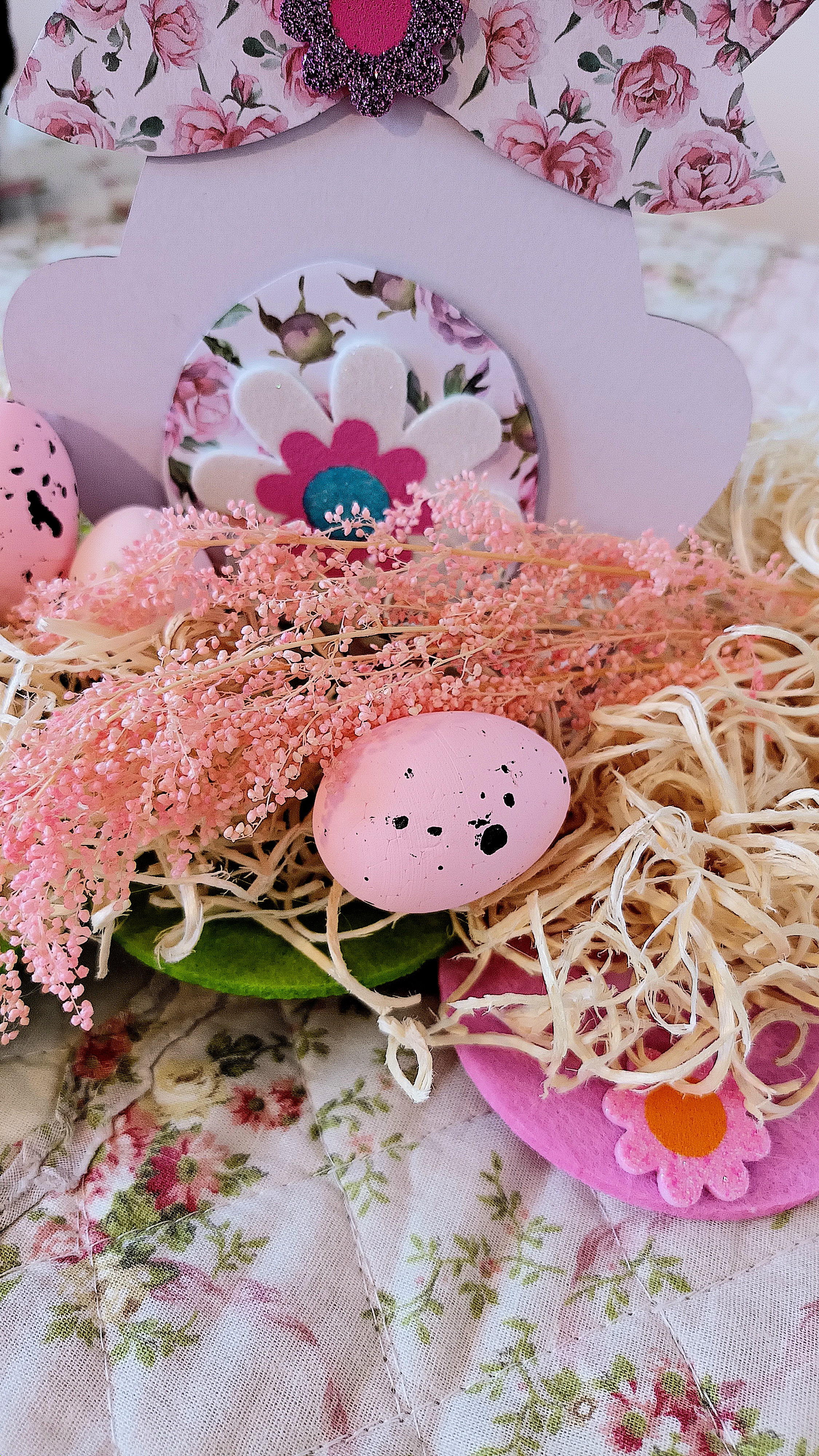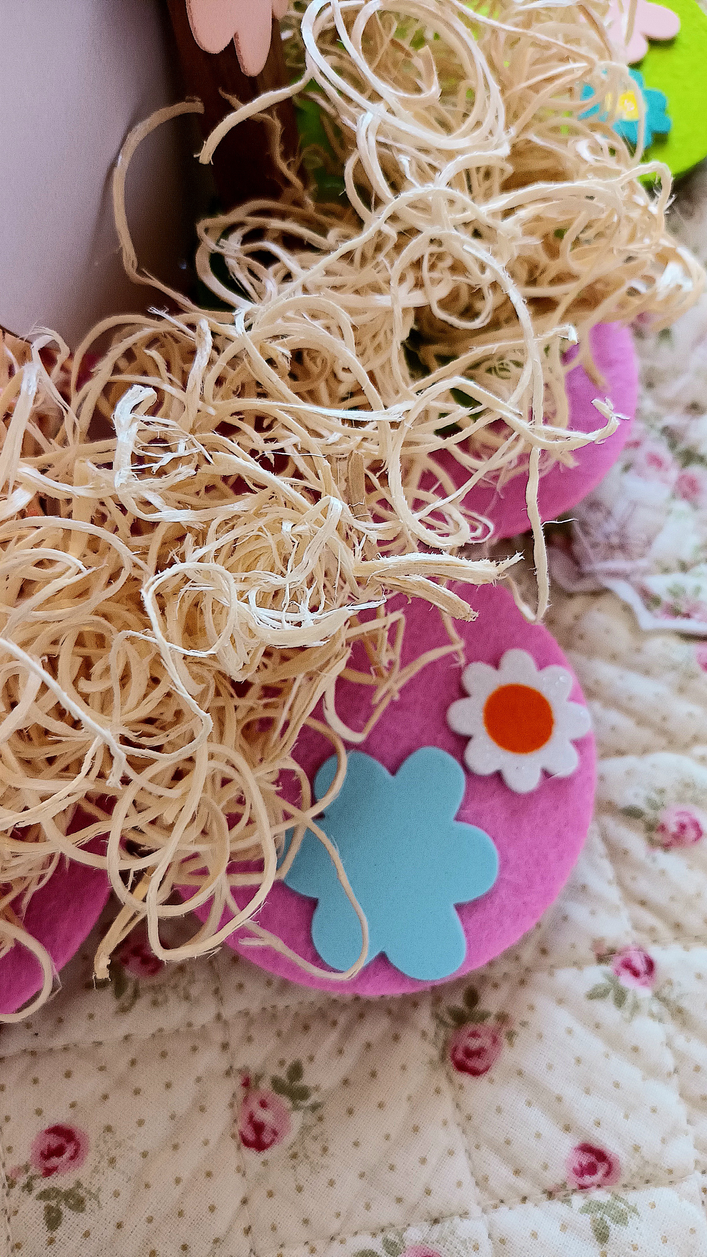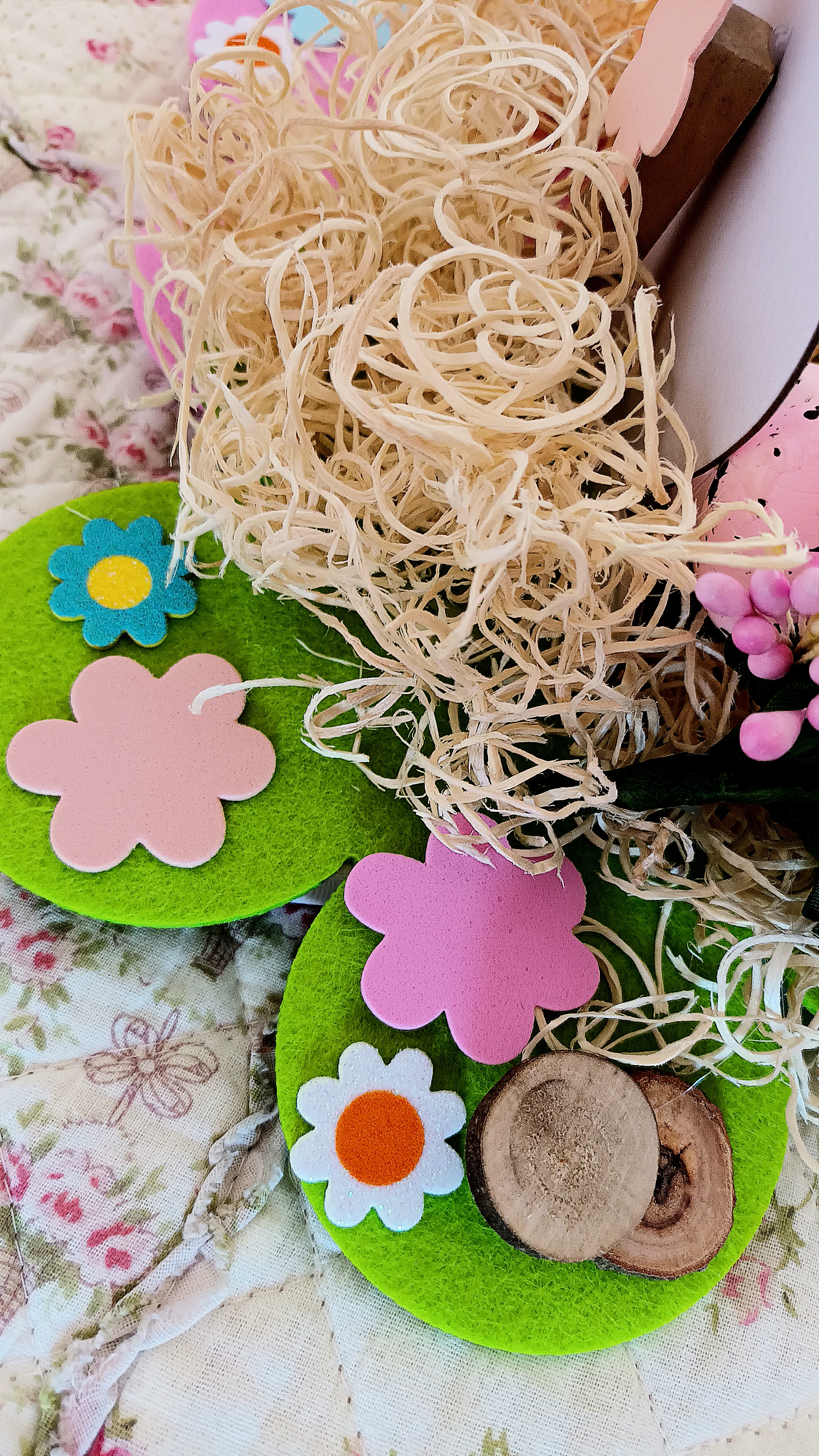 Prendiamo ora la base in tela e applichiamoci sopra con la colla a caldo due basi in feltro a forma di fiore, in modo da ricoprirla interamente. Incolliamo al centro la sagoma appena decorata del nostro coniglietto e tutt’intorno inseriamo a nostro piacimento i fiori secchi e i vari elementi in gommapiuma, legno compensato e corteccia di betulla che compongono la decorazione da spargere da noi scelta. Come tocco finale, aggiungiamo qualche fiorellino adesivo qua e là e il piccolo mazzo di fiori decorativi.