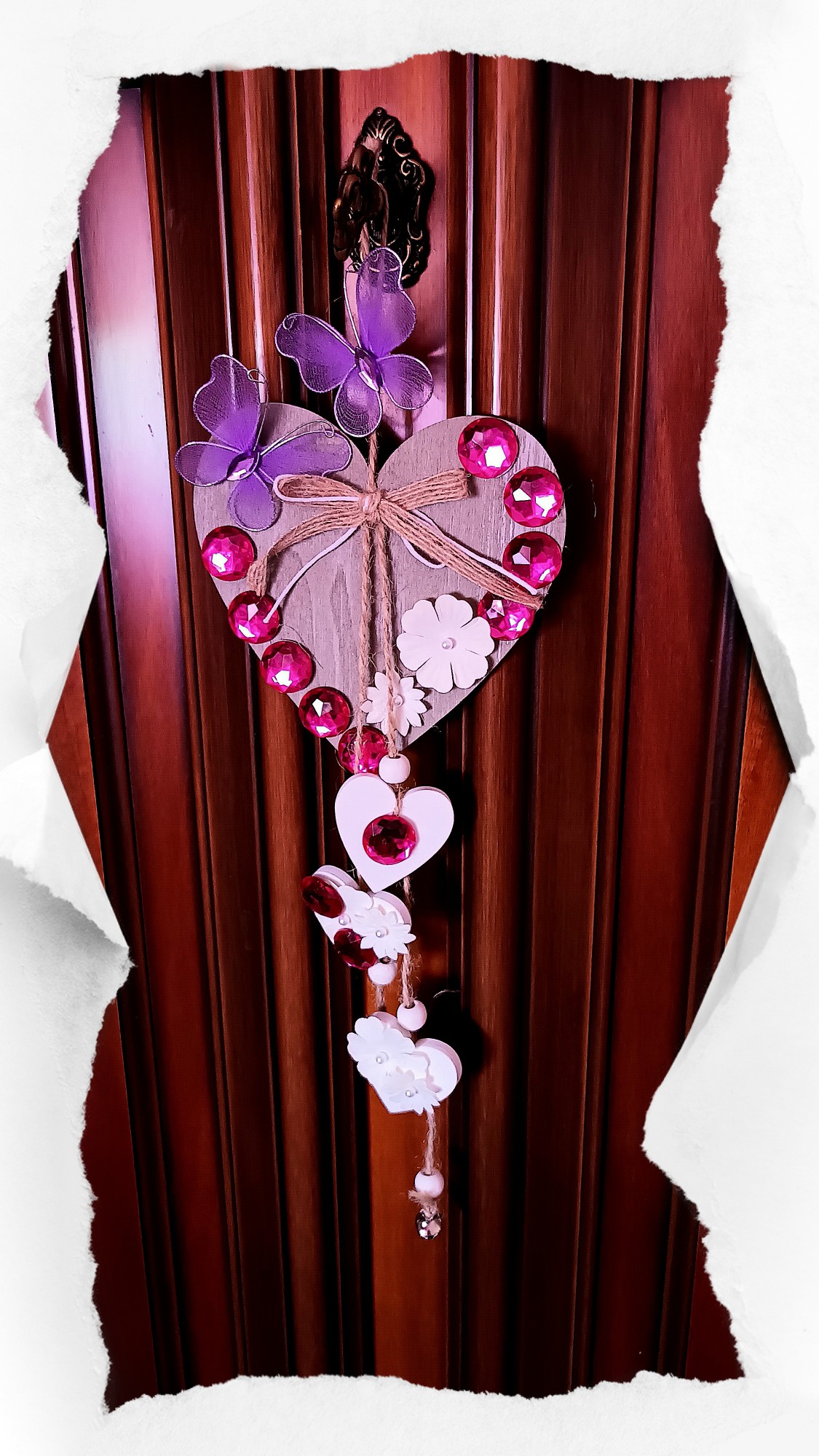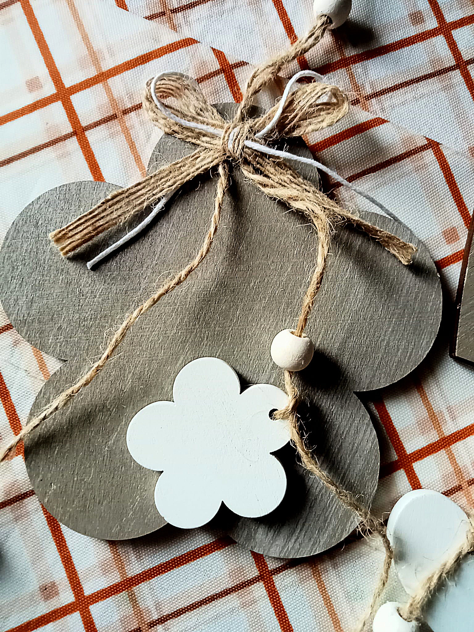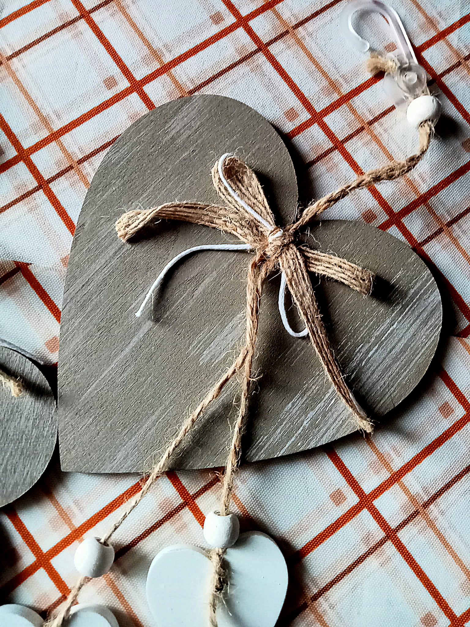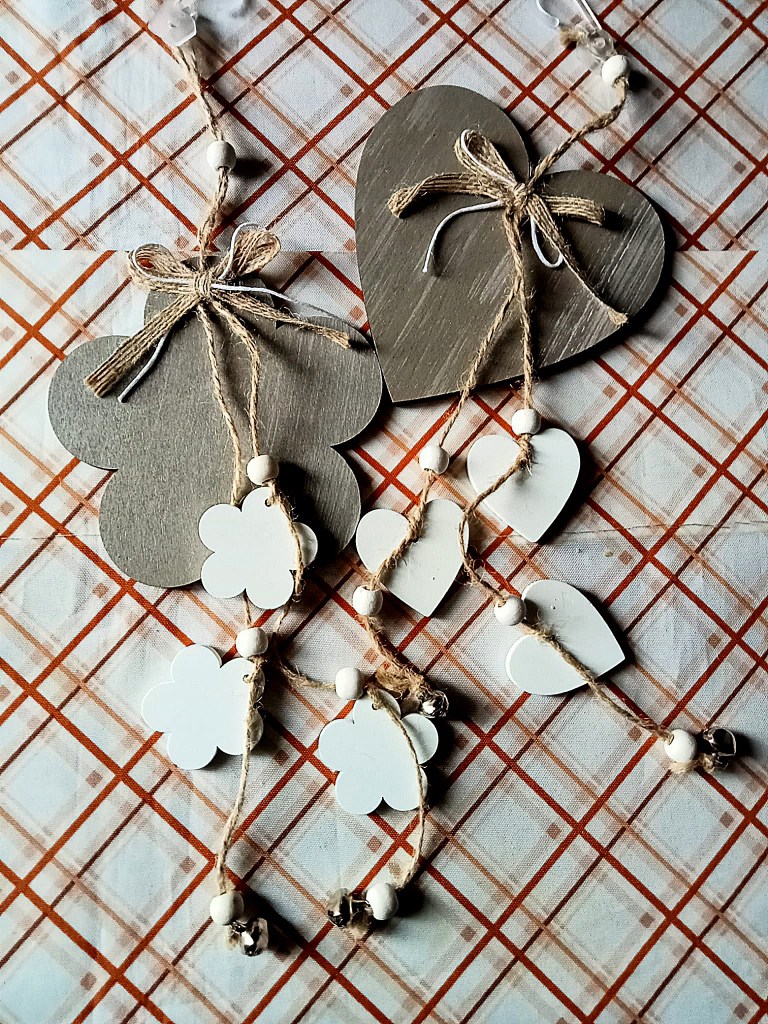 - 2 ciondoli decorativi in legno a forma di cuore e di fiore