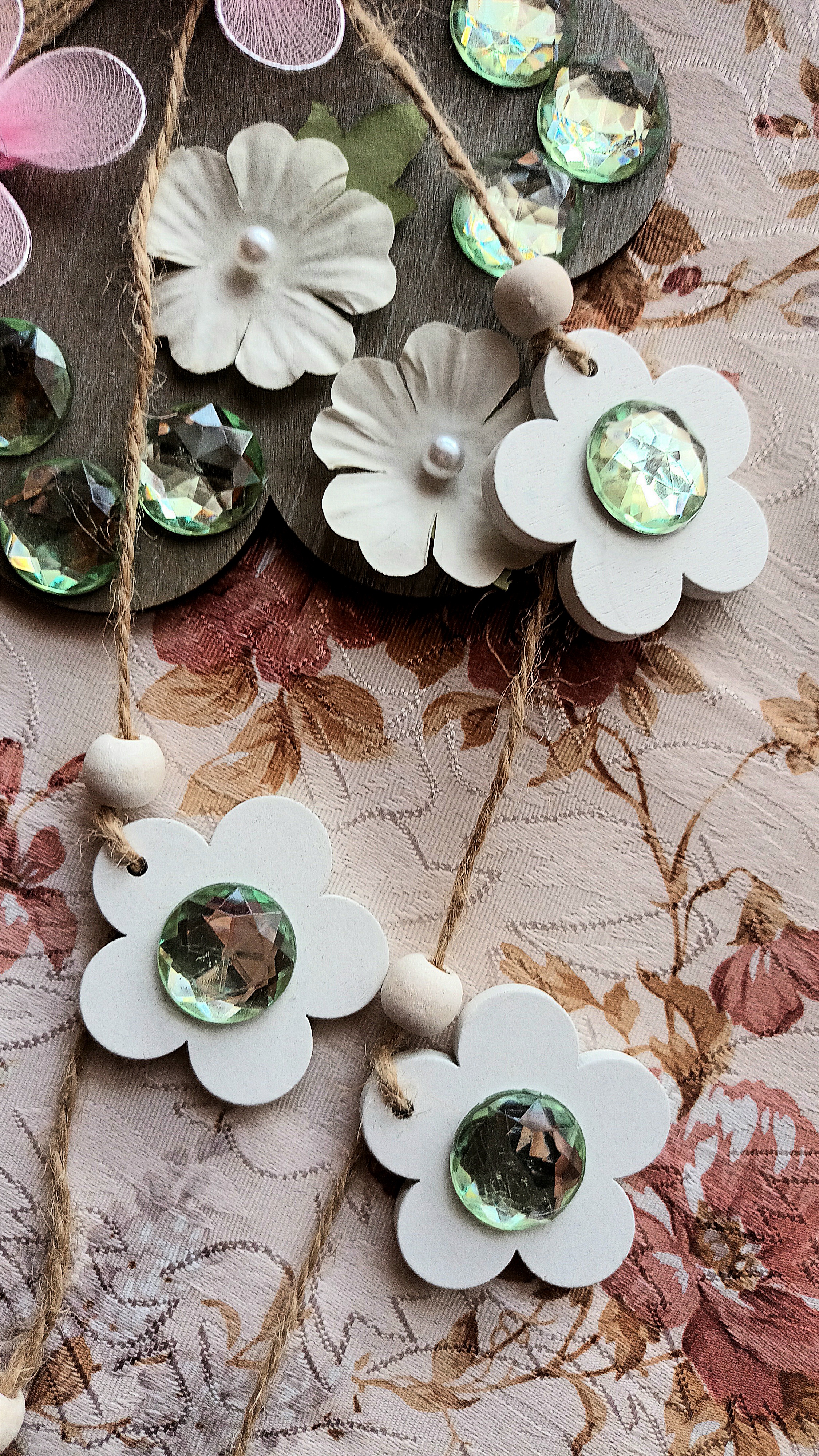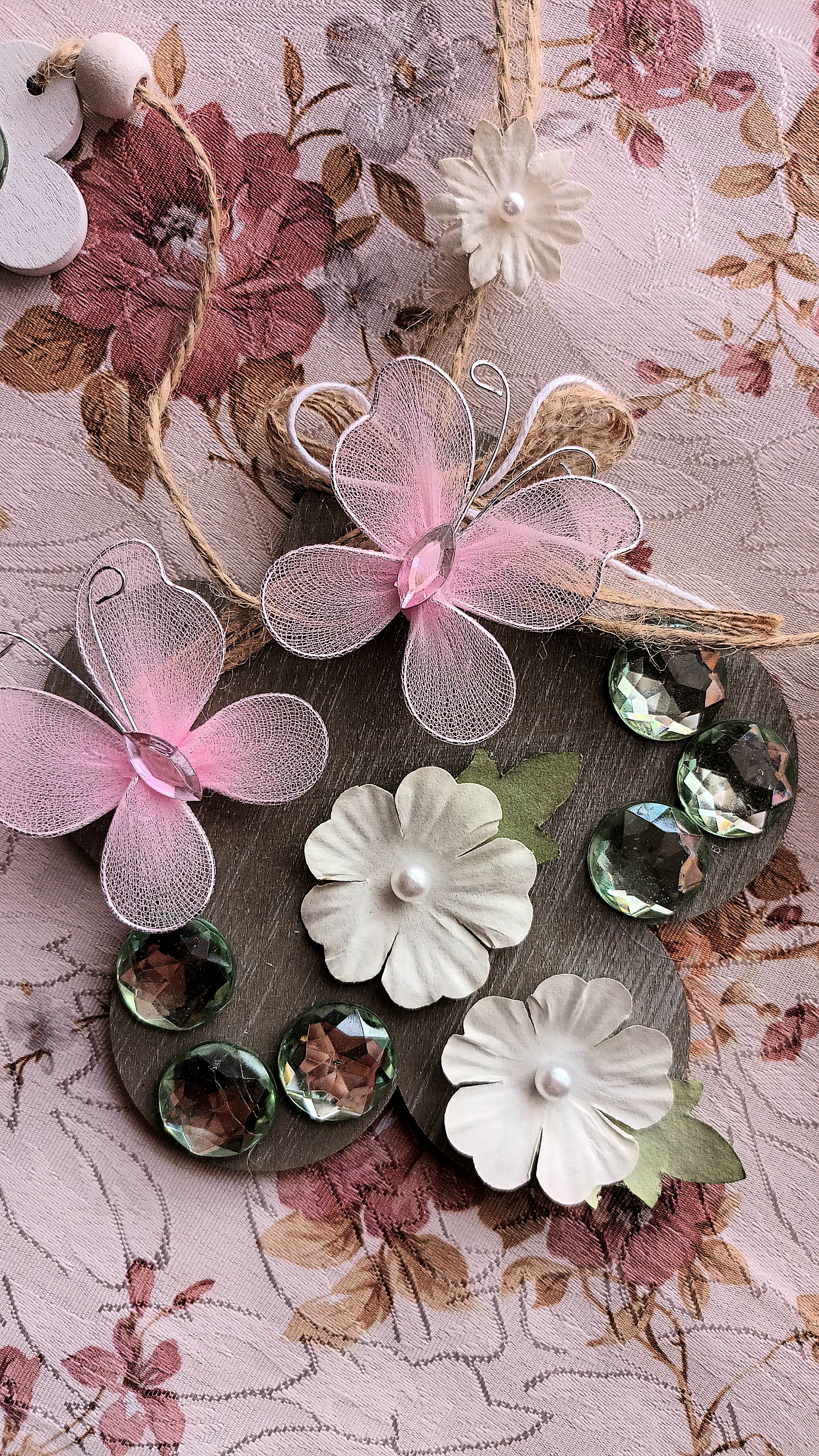 Avete trovato tutto il necessario? Perfetto! Ora finalmente possiamo iniziare il nostro lavoro creativo, applicando con la colla a caldo su ciascun ciondolo in legno i cristalli strass, i fiorellini di carta e le farfalle in organza a nostra disposizione e come più ci piace.